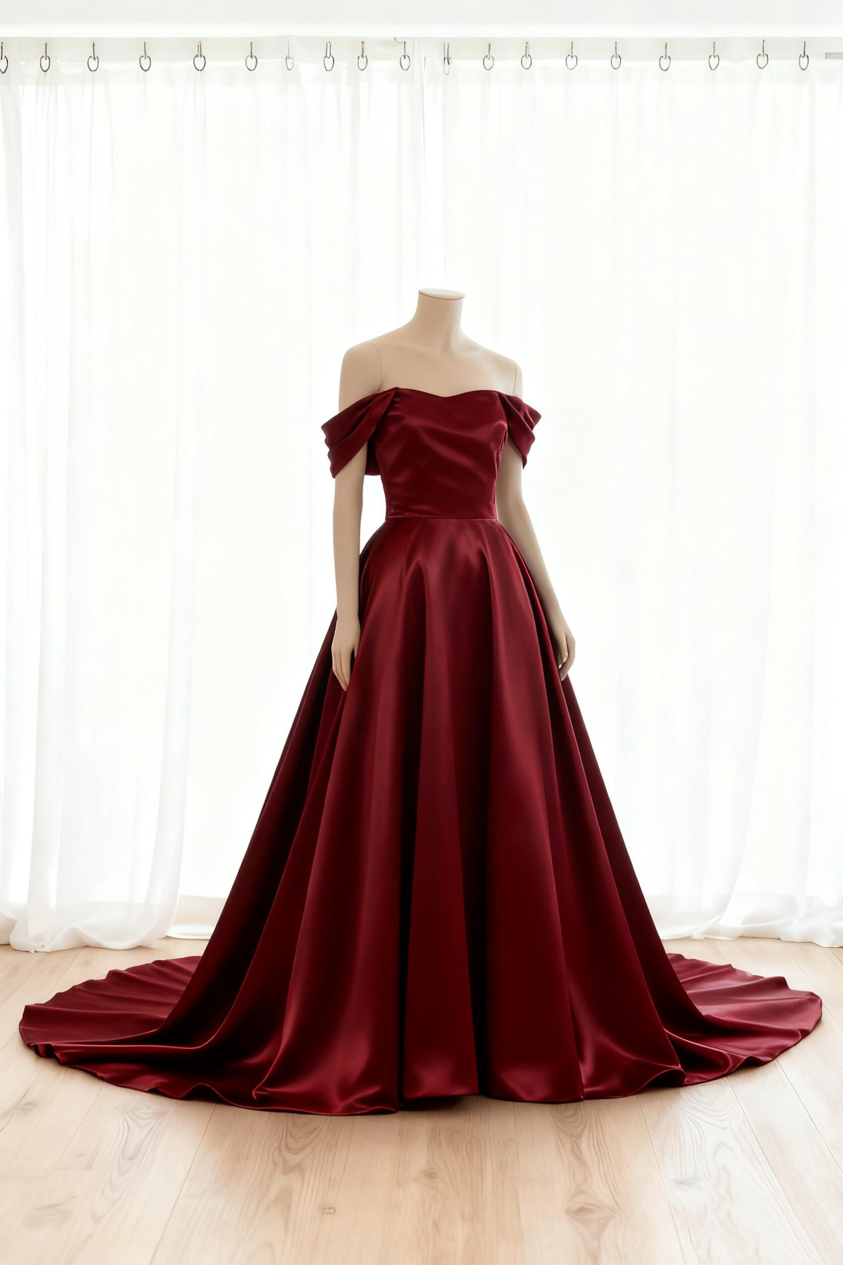 パーティードレス ボルドー色 オフショルダー 光沢サテン エレガント 前撮り 音楽会