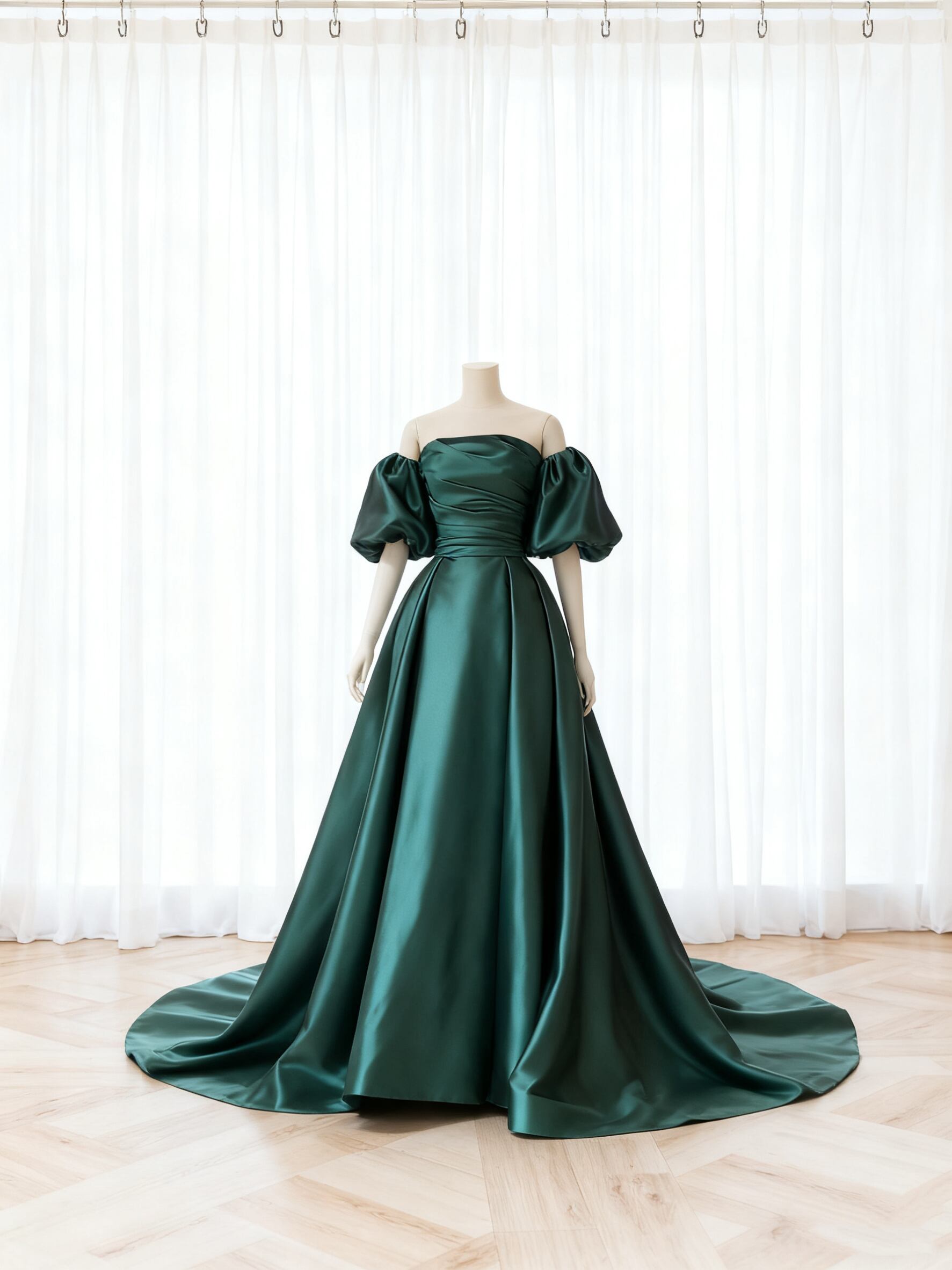 カラードレス グリーン パフスリーブドレス ハンドドレープ エレガント アンティークなドレス ピアノ演奏会
