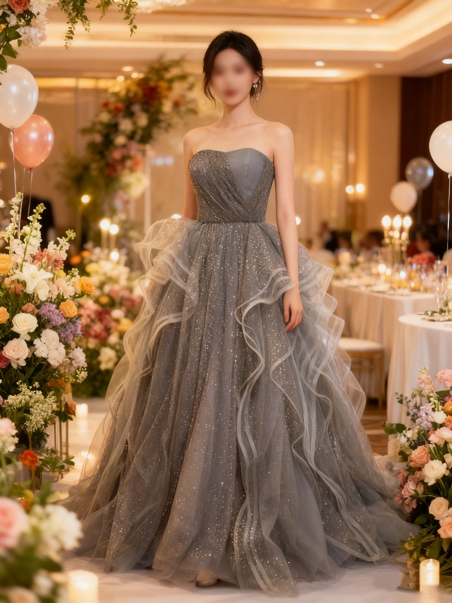 カラードレス グレー ベアトップ キラキラグリッターチュール ラッフルフリル アシンメトリードレス 結婚式