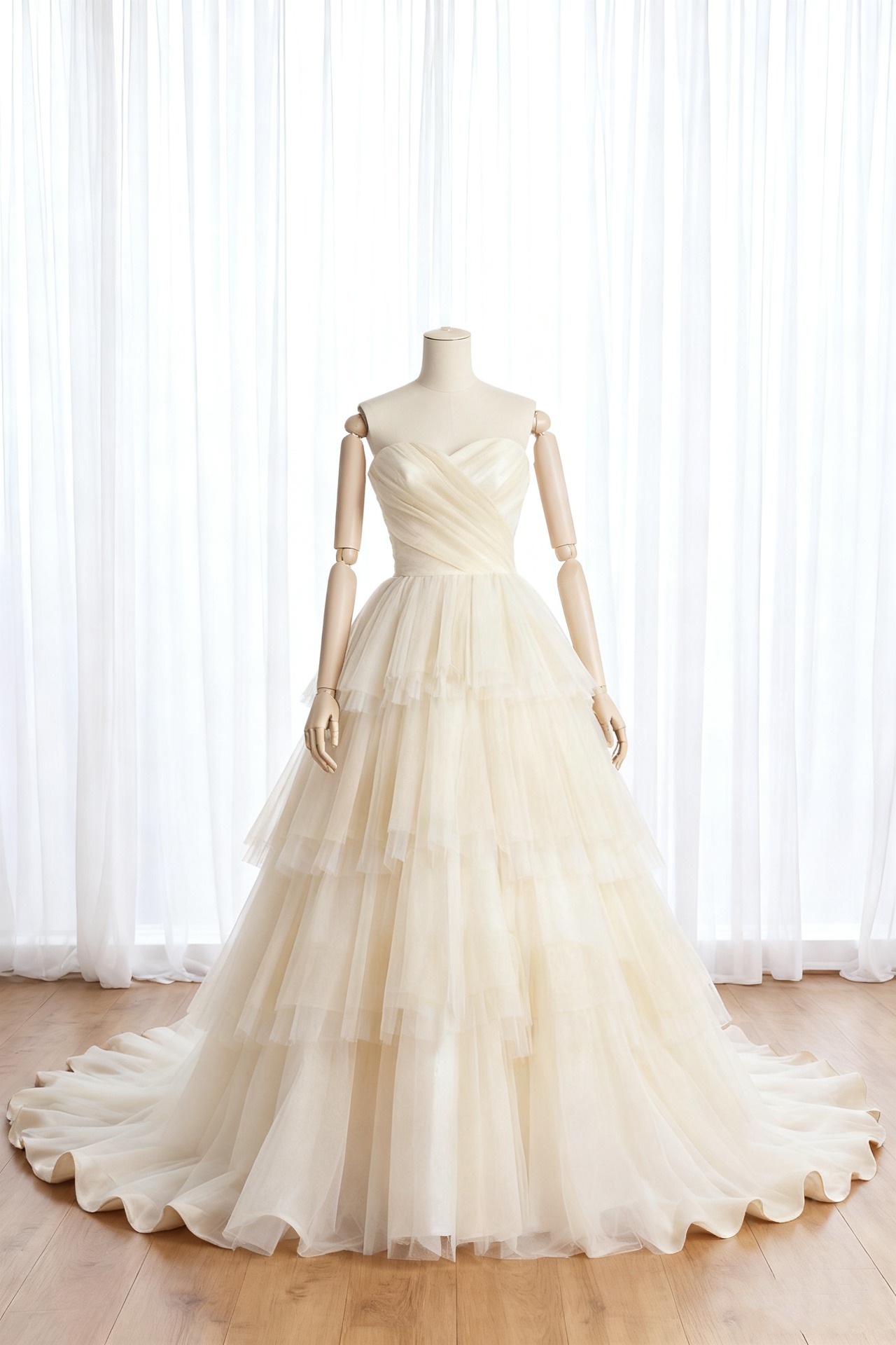 ウエディングドレス ティアードのドレス ベアトップ 結婚式 憧れのドレス アイボリー ブライダル