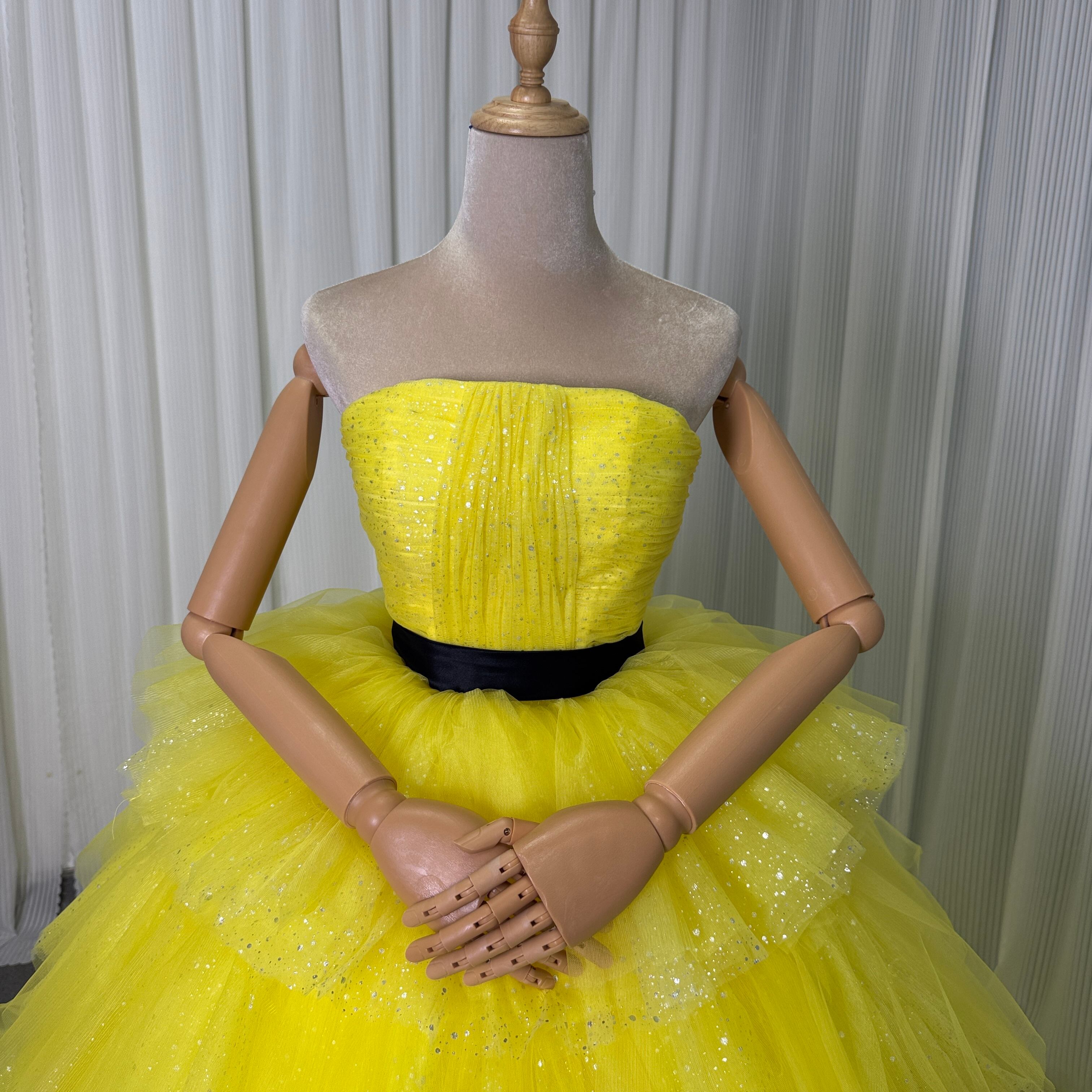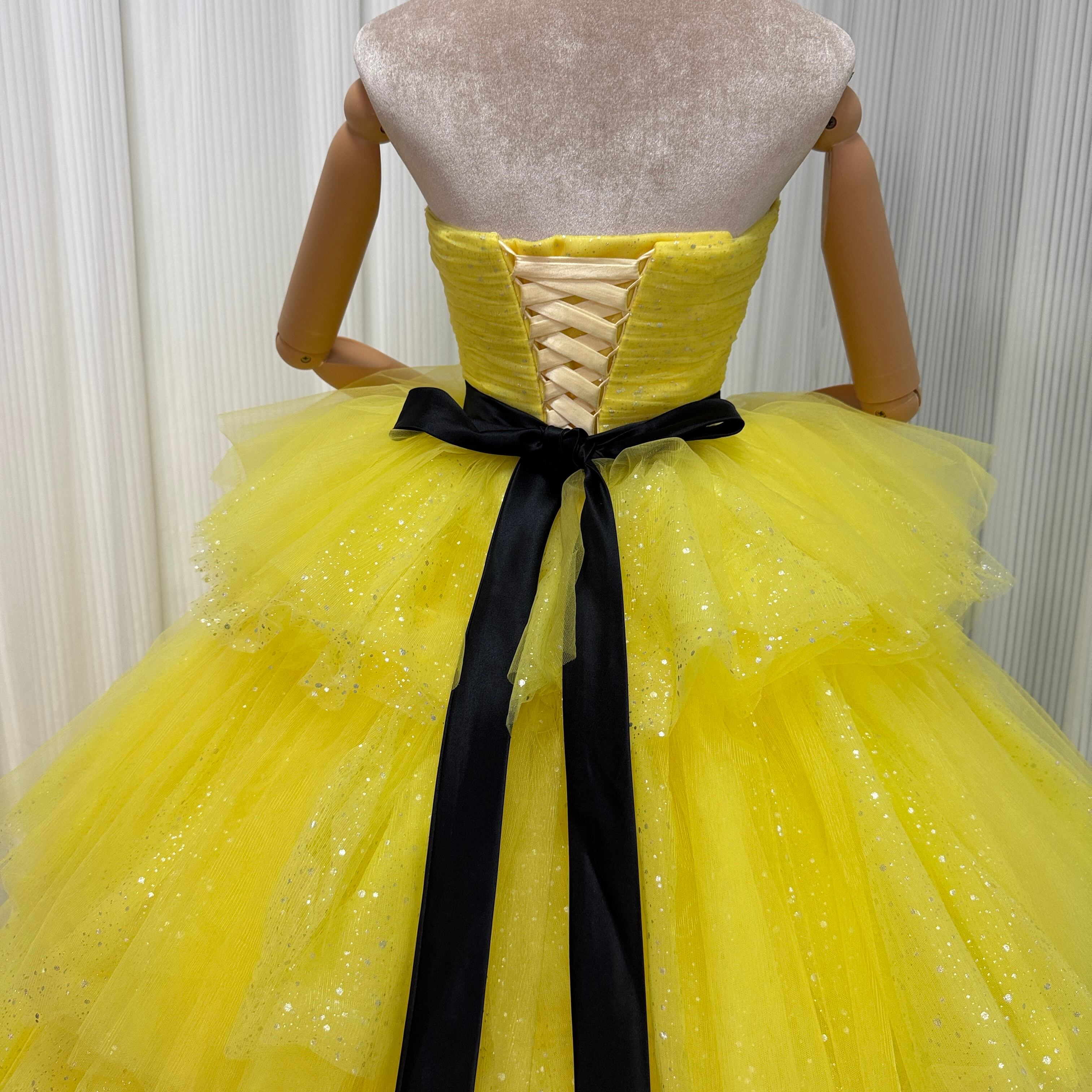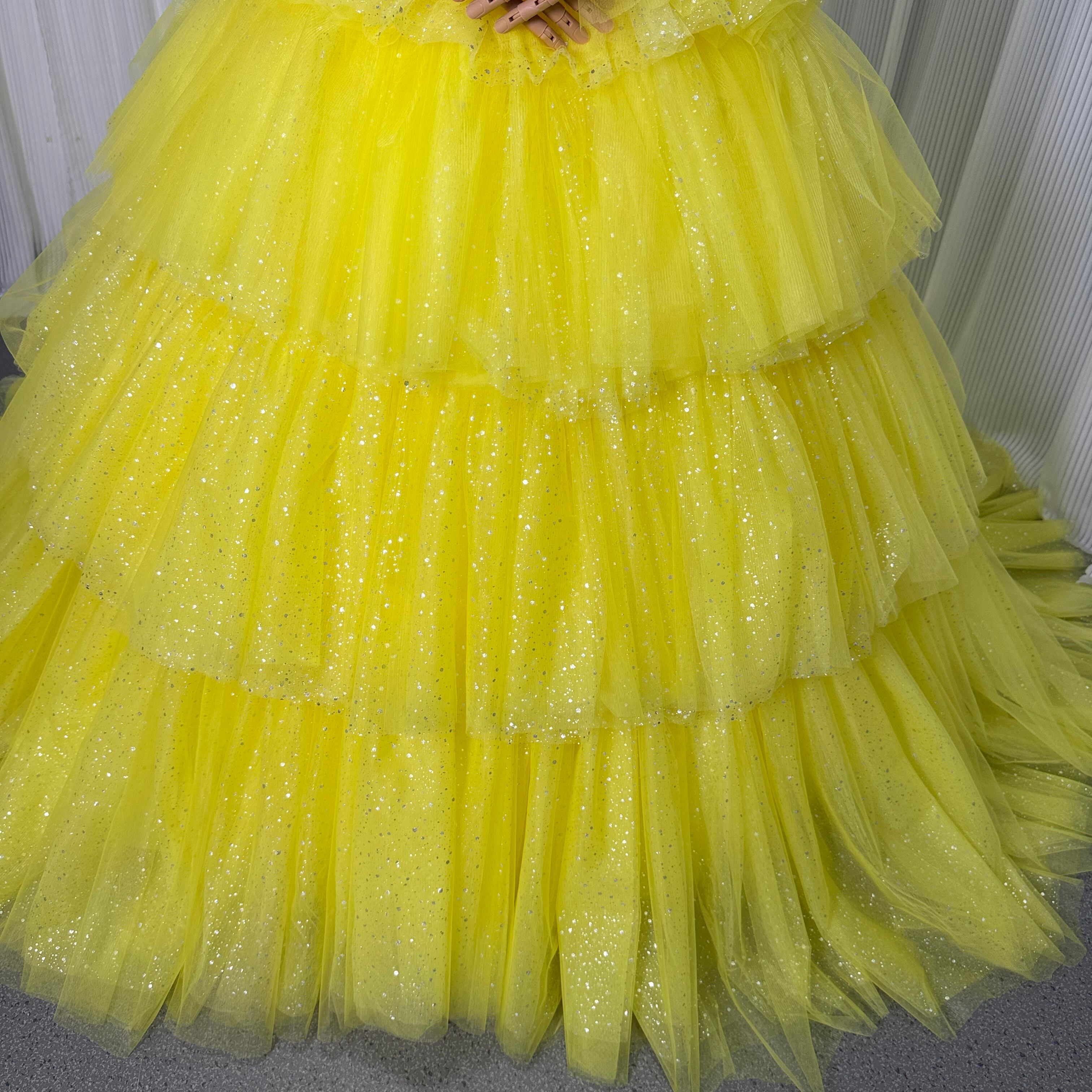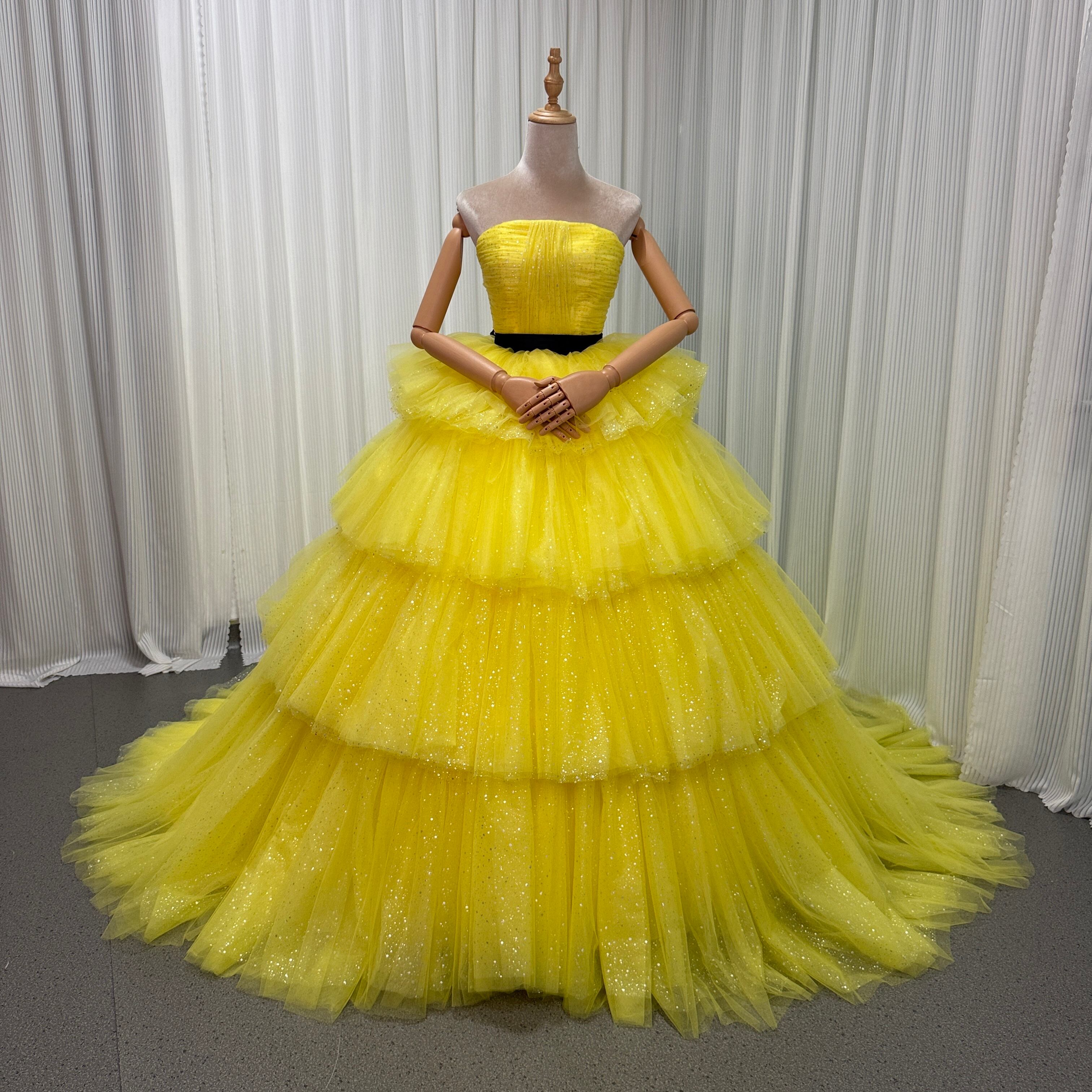 カラードレス ビスチェドレス イエロー キラキラグリッターチュール 結婚式 ティアードのドレス