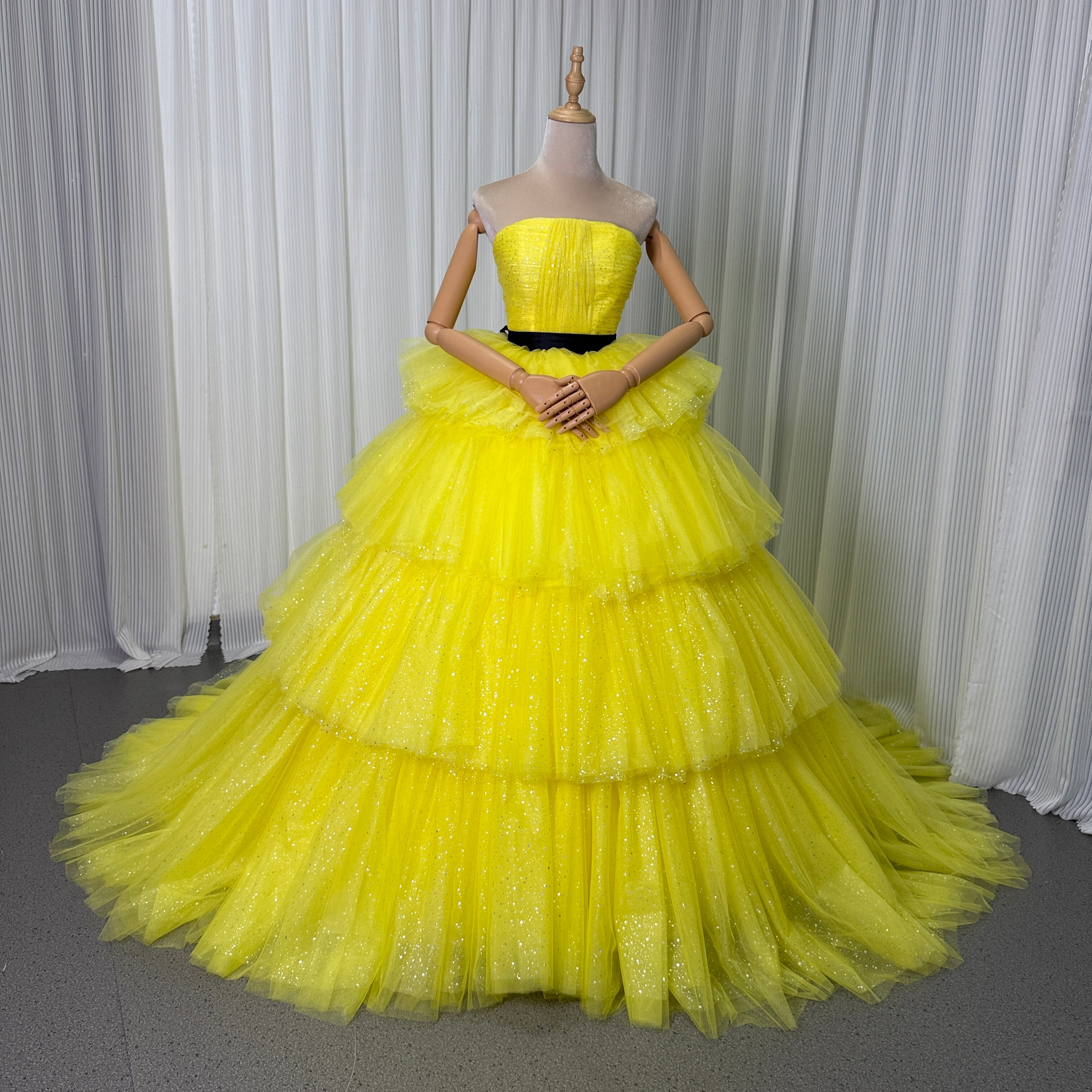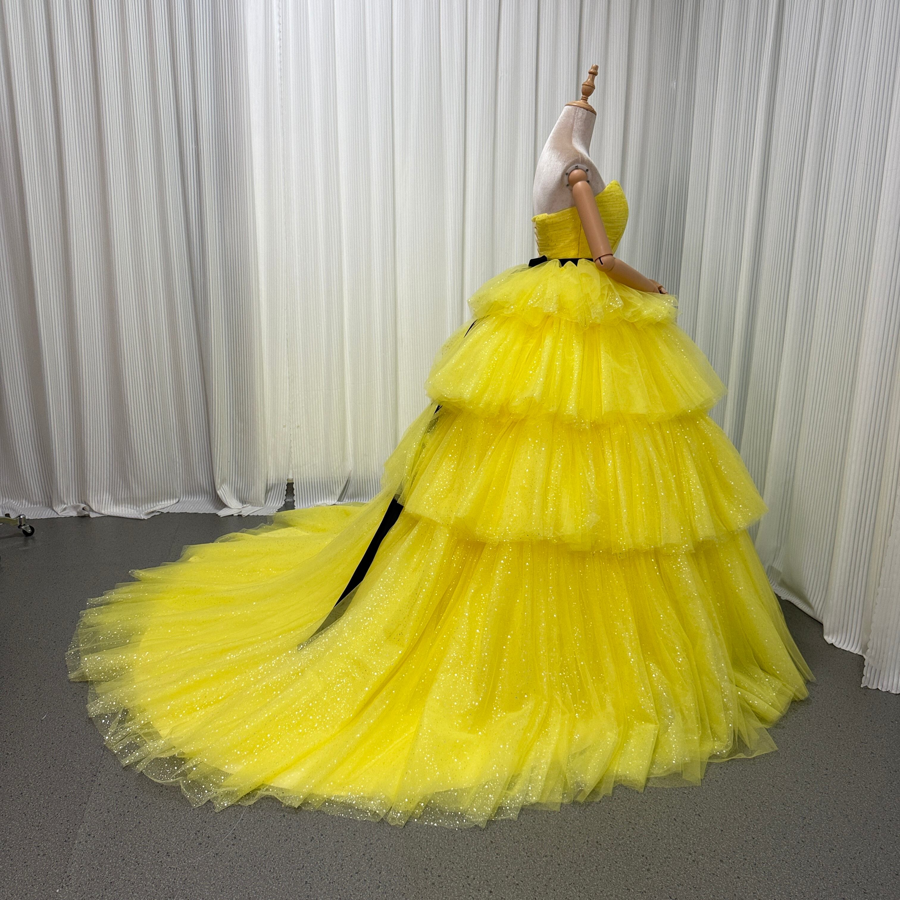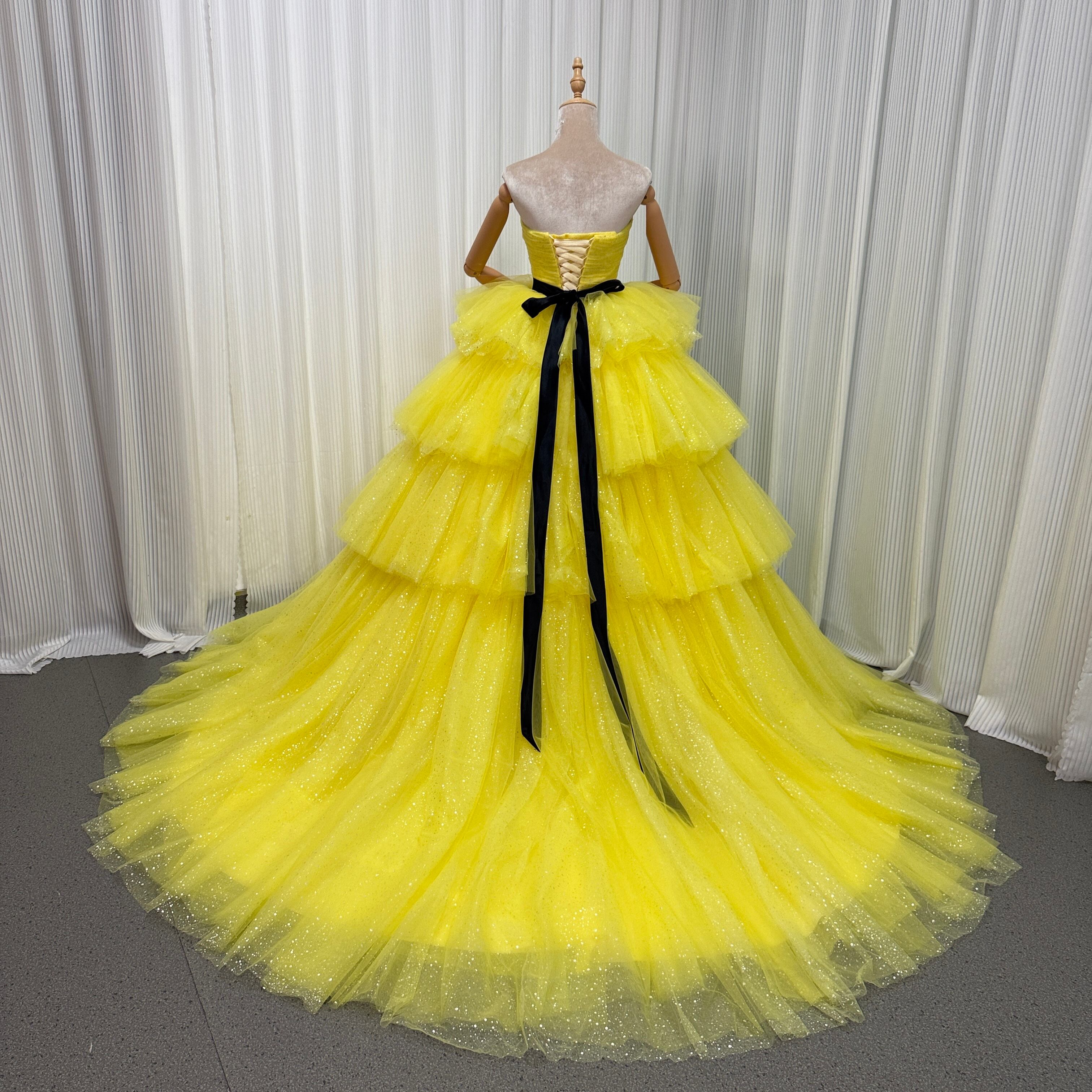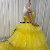 カラードレス ビスチェドレス イエロー キラキラグリッターチュール 結婚式 ティアードのドレス