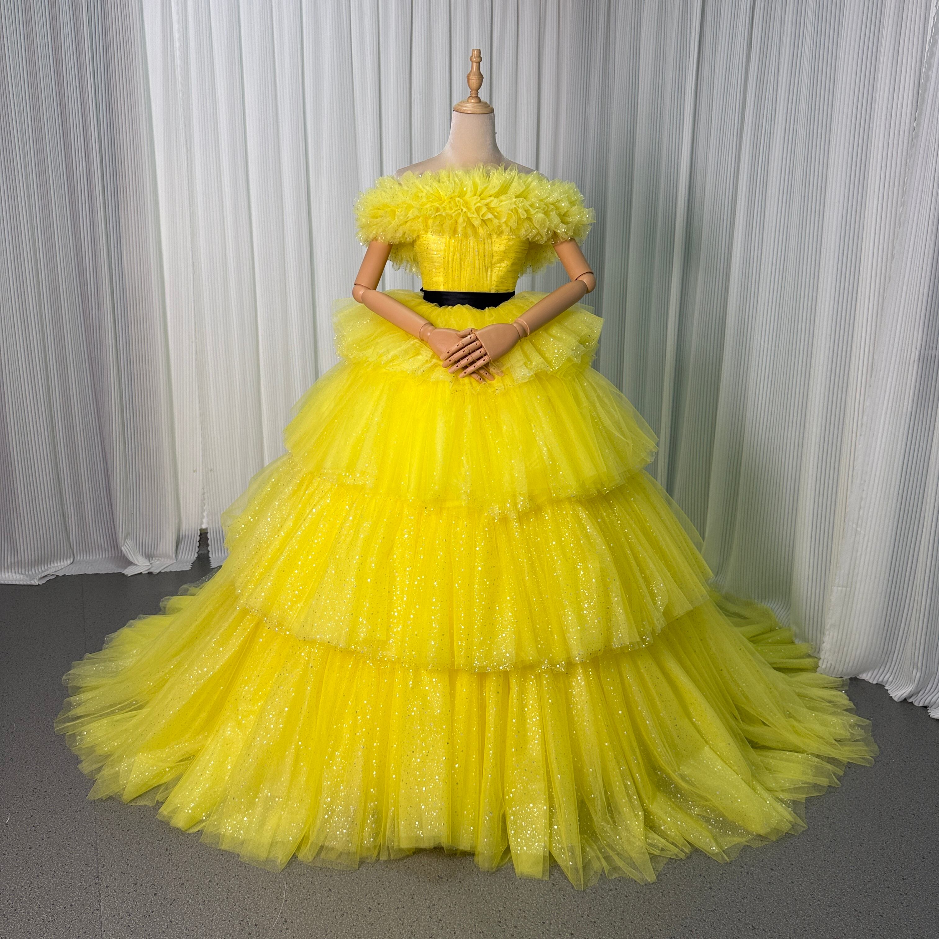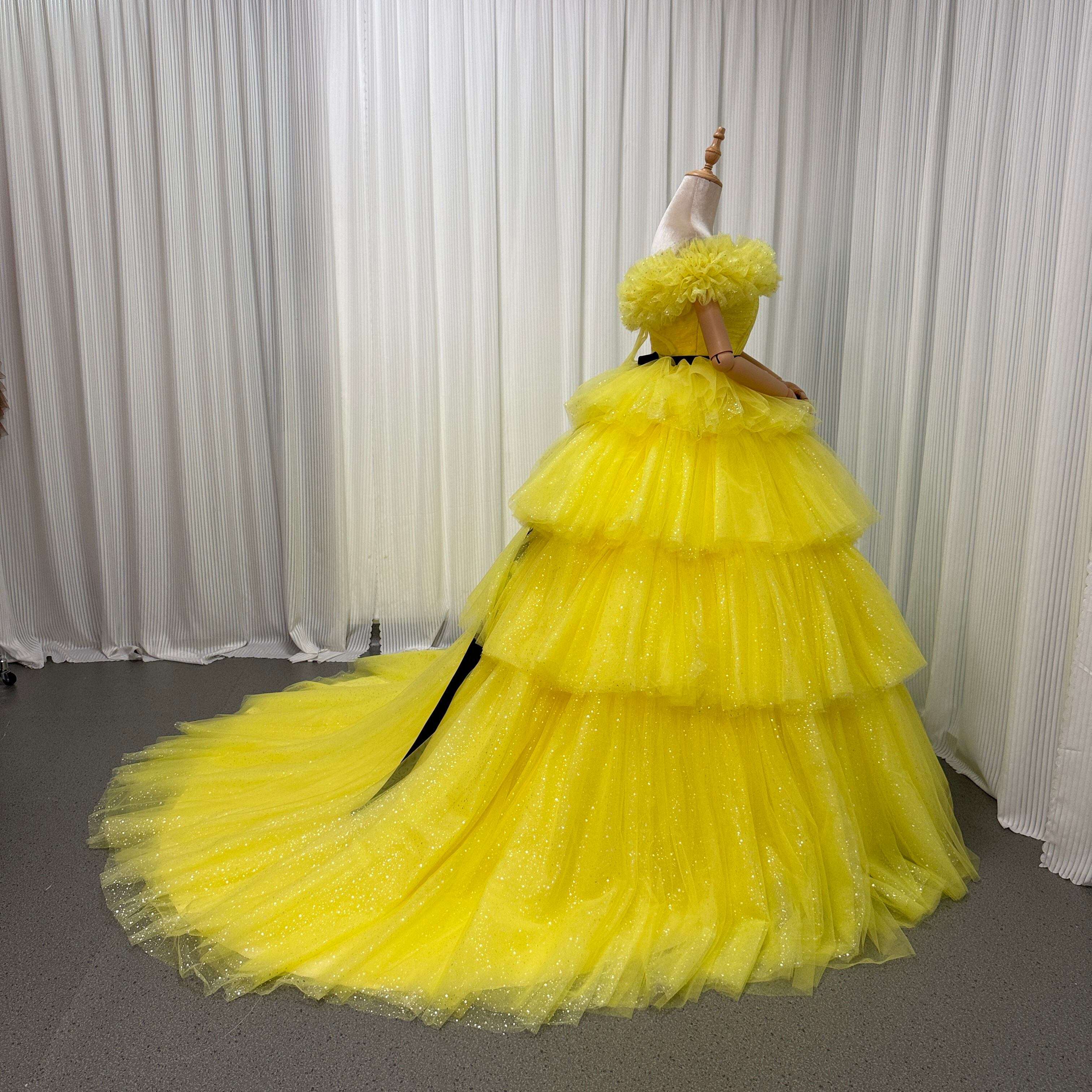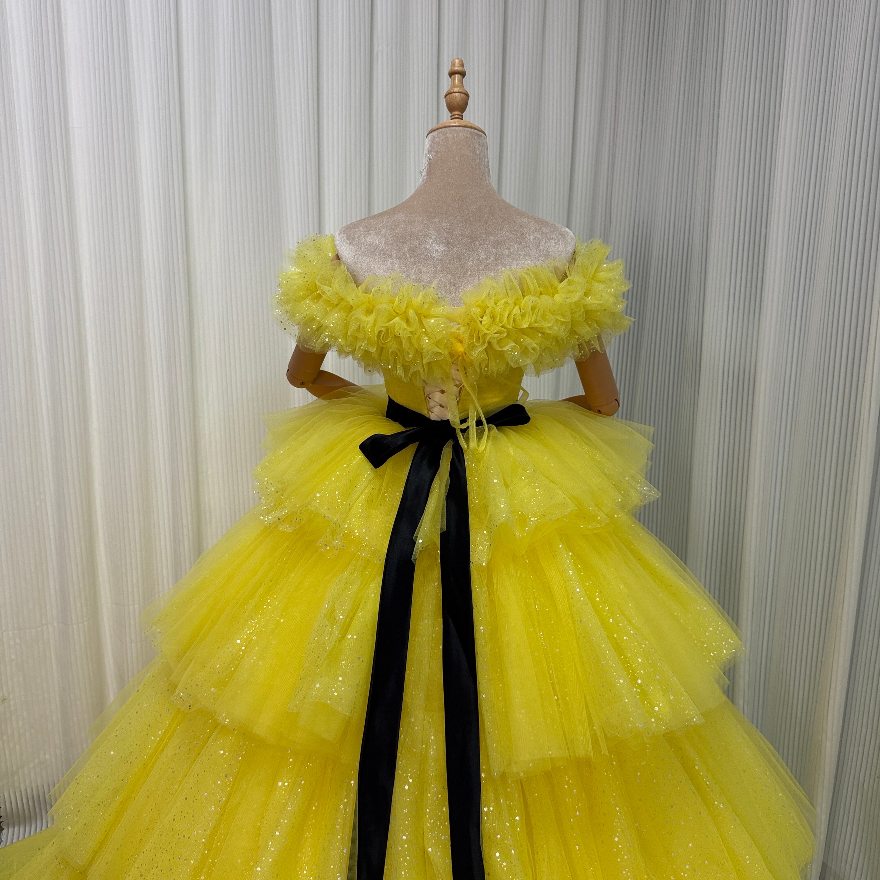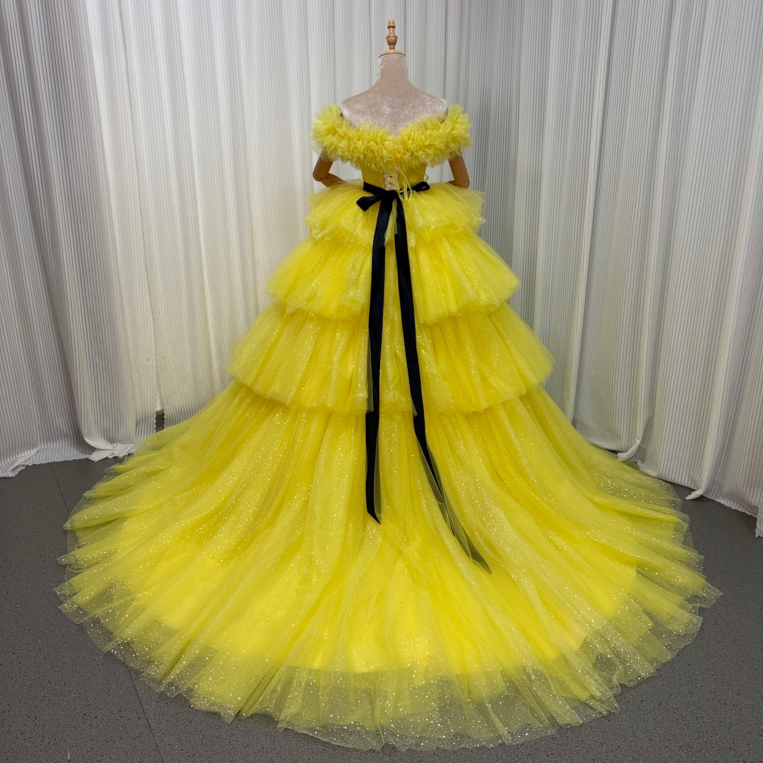 カラードレス 取り外し可能なオフショルダー イエロー キラキラグリッターチュール 結婚式 ティアードのドレス