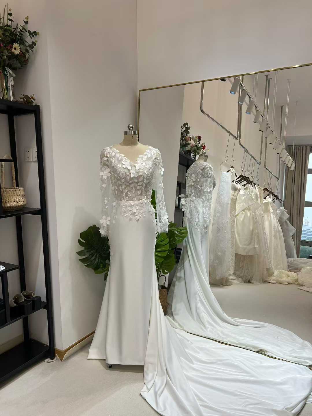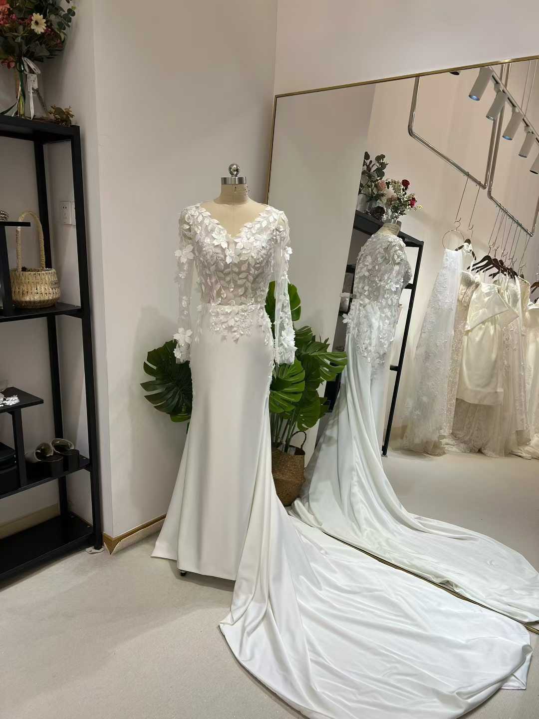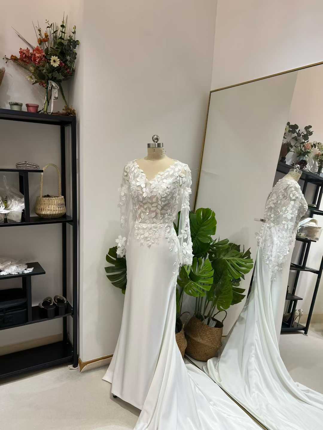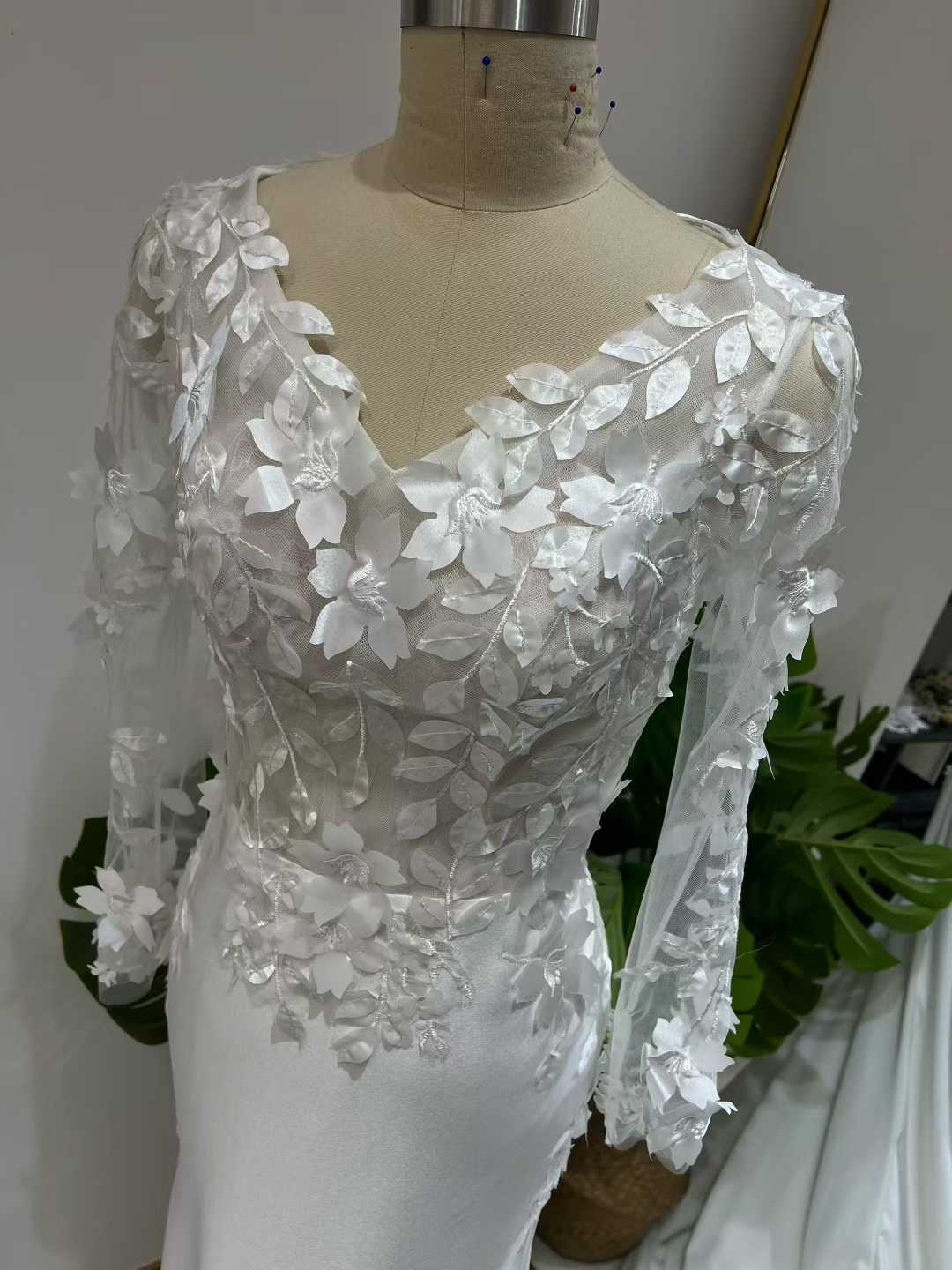 ウエディングドレス ロングスリーブ Vネック リーフ刺繍 マーメイドライン 優雅なシルエット ブライダル