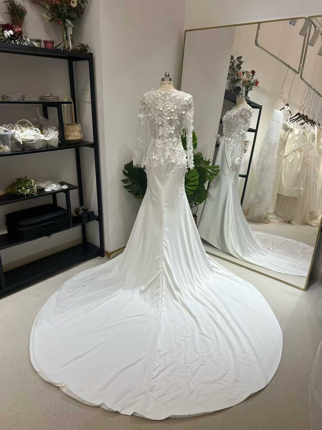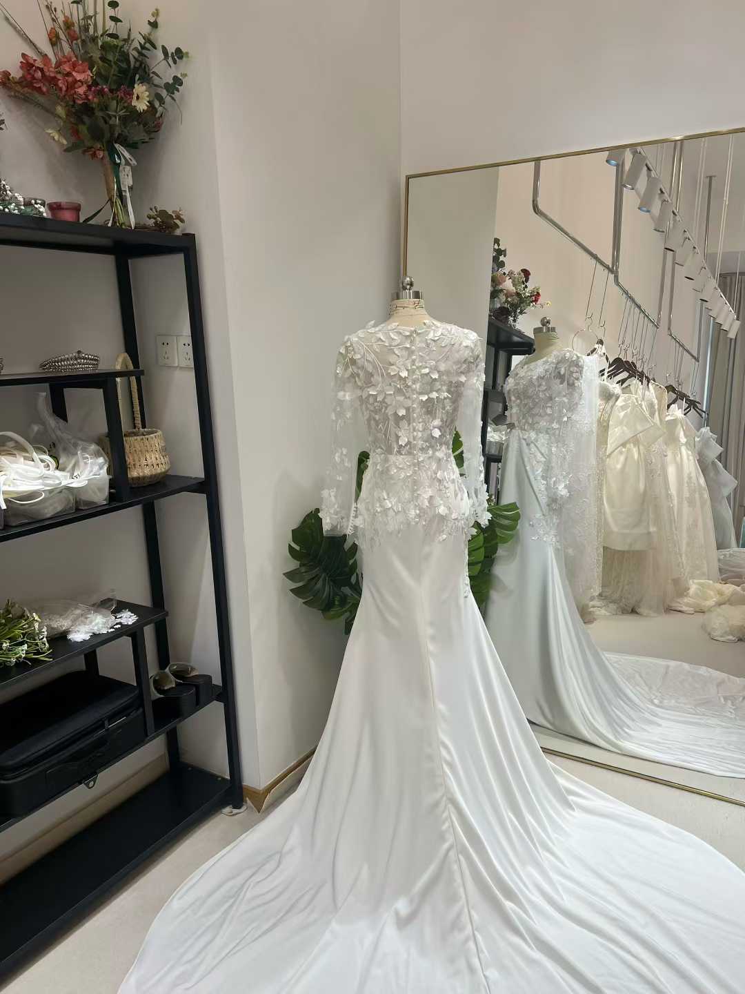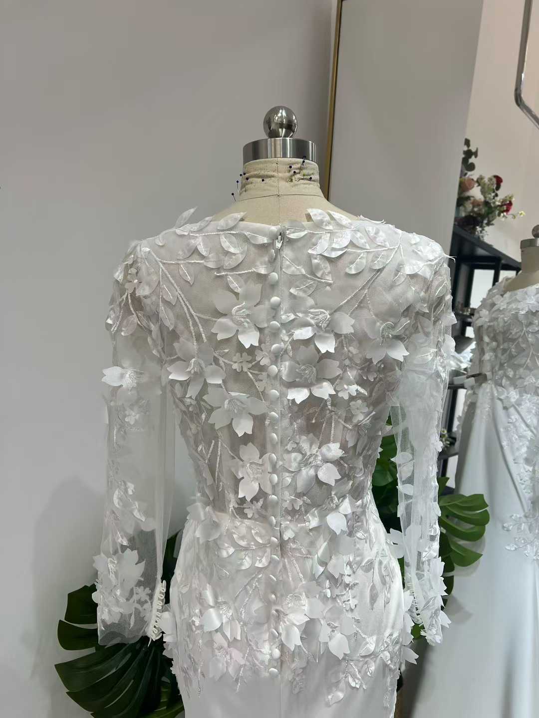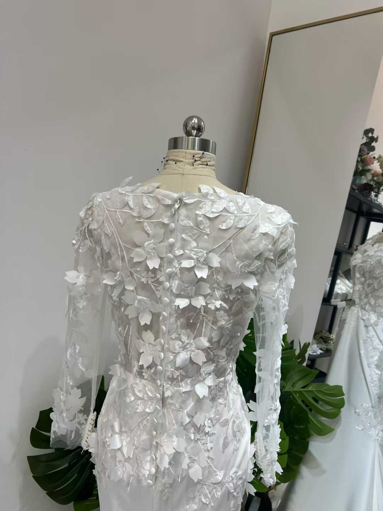 ウエディングドレス ロングスリーブ Vネック リーフ刺繍 マーメイドライン 優雅なシルエット ブライダル