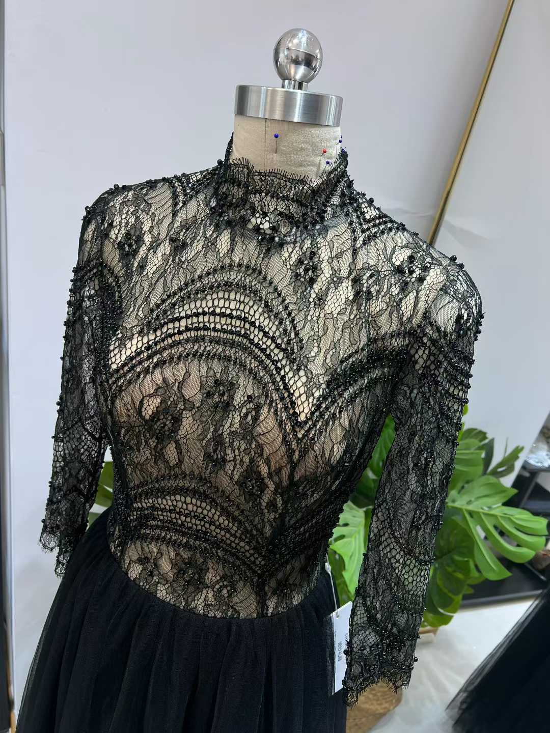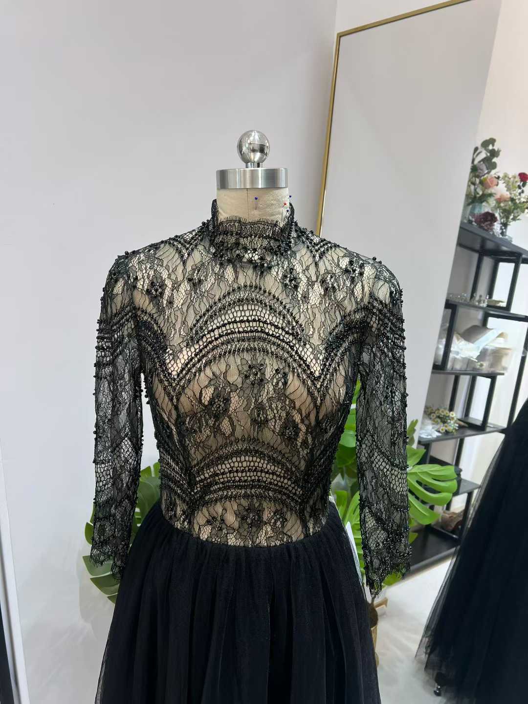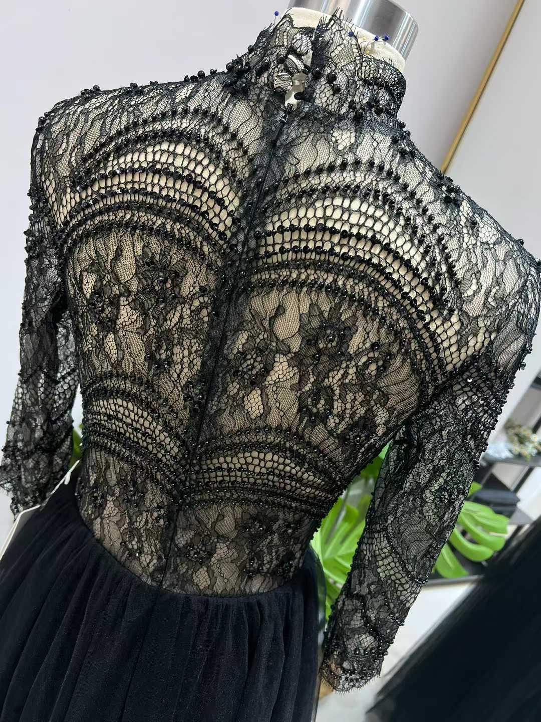 パーティードレス ハイネック ブラック ビーズ 床付く チュールスカート エレガント アンティークなドレス