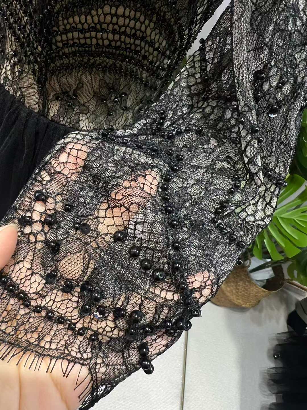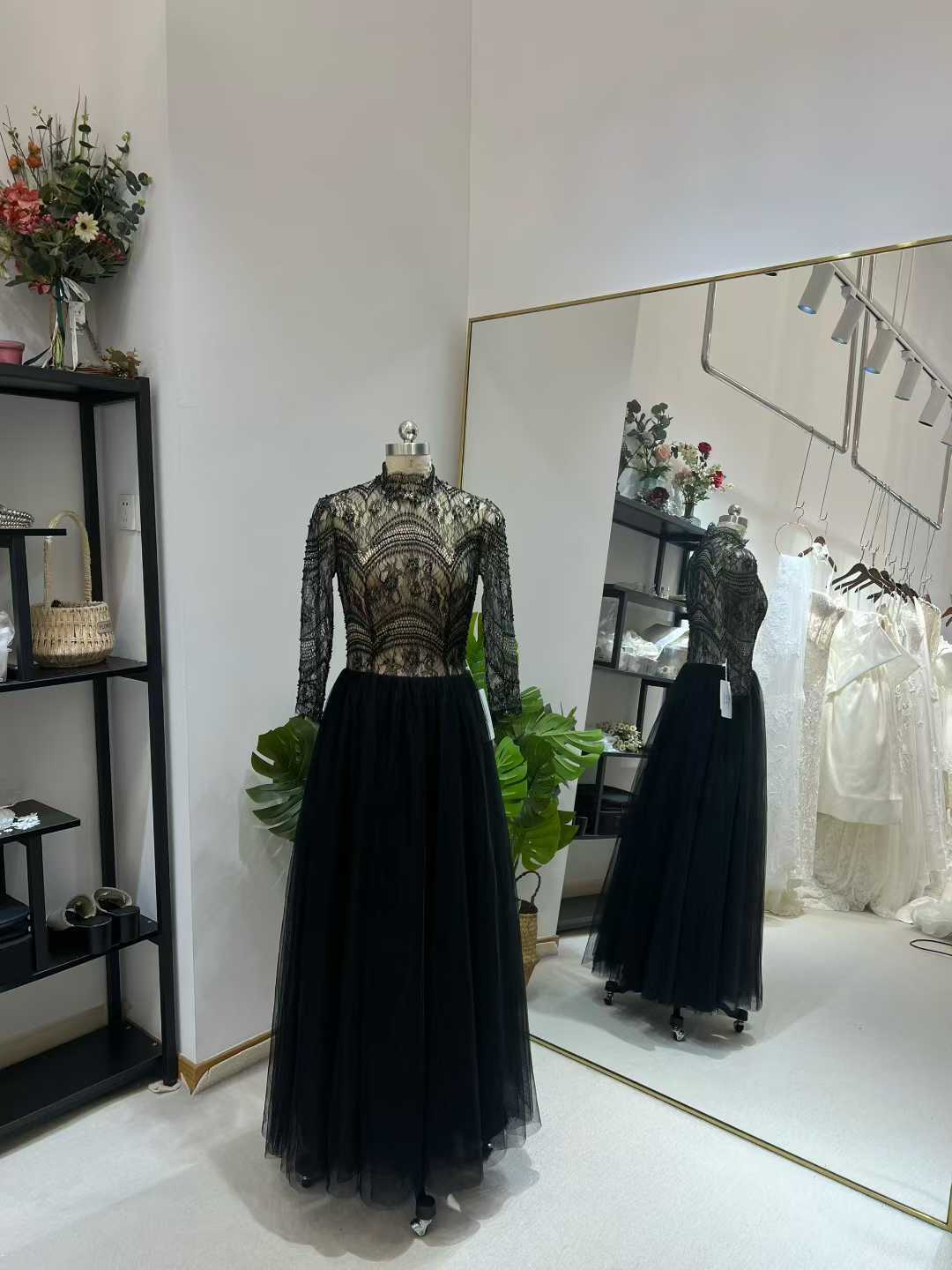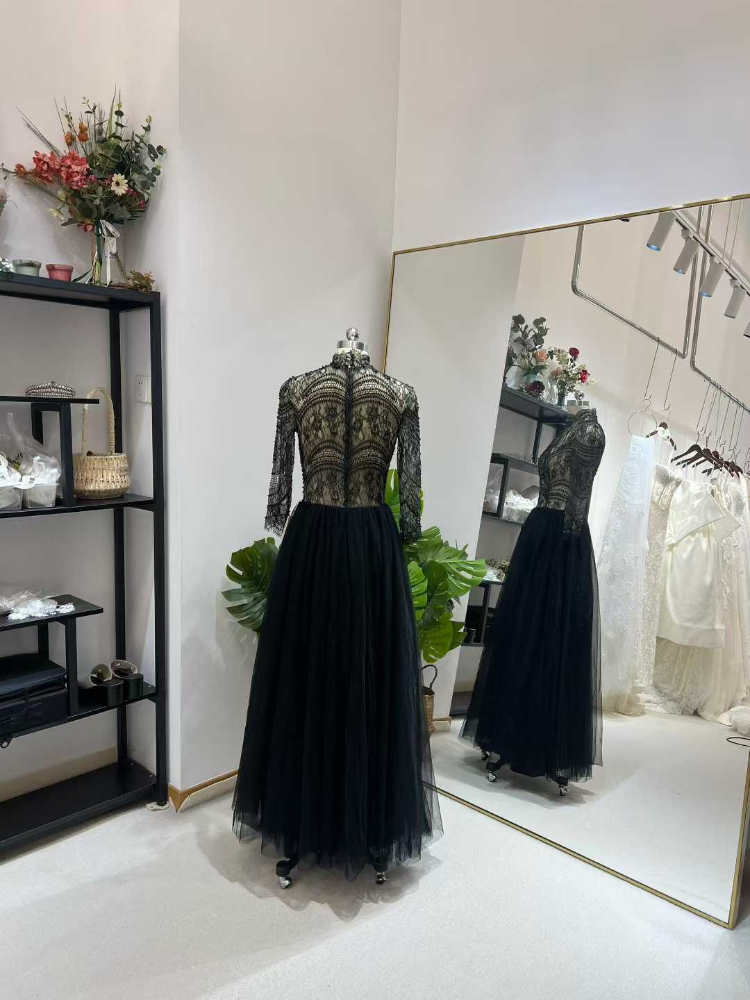 パーティードレス ハイネック ブラック ビーズ 床付く チュールスカート エレガント アンティークなドレス