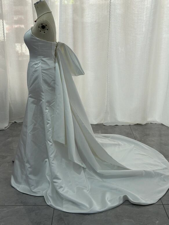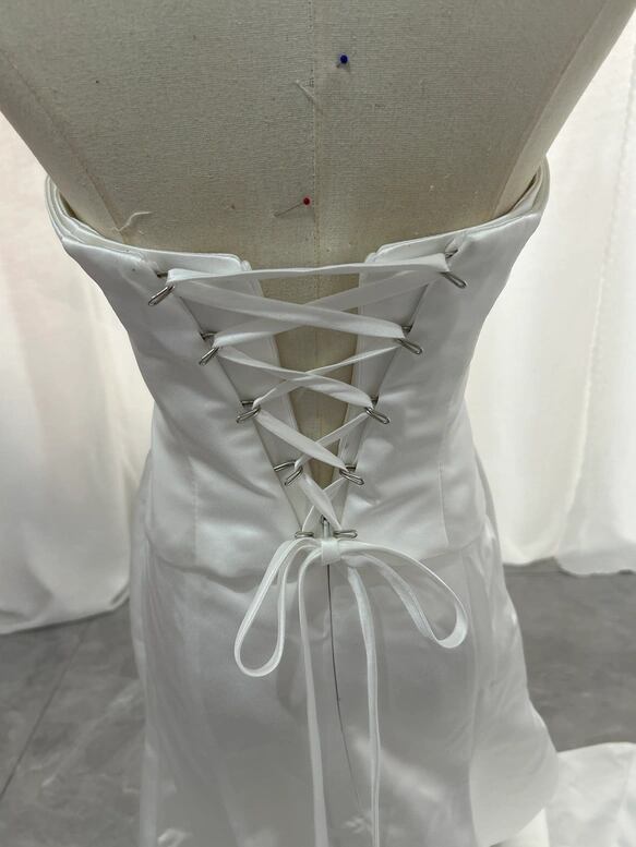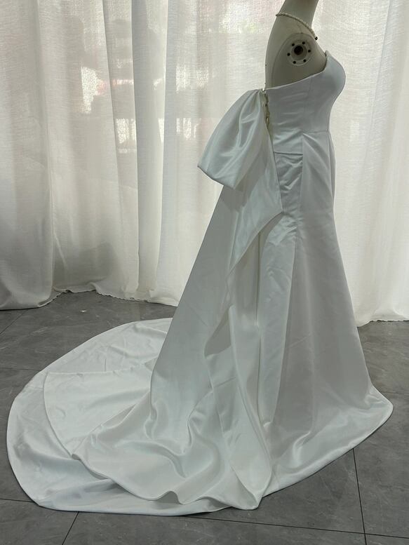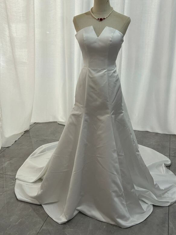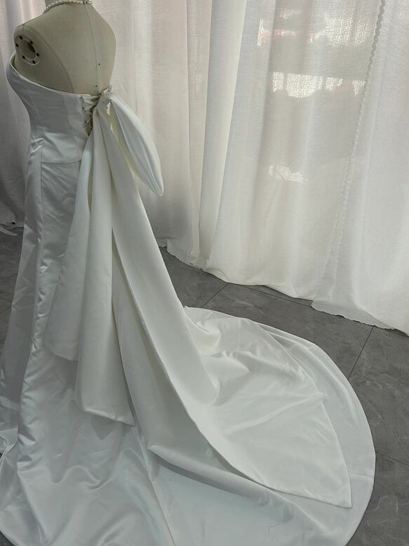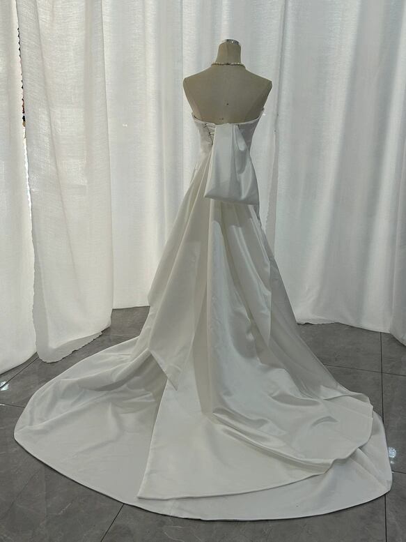 ウエディングドレス 光沢サテン ベアトップ バックリボン 編み上げ 細見えシルエット 拳式