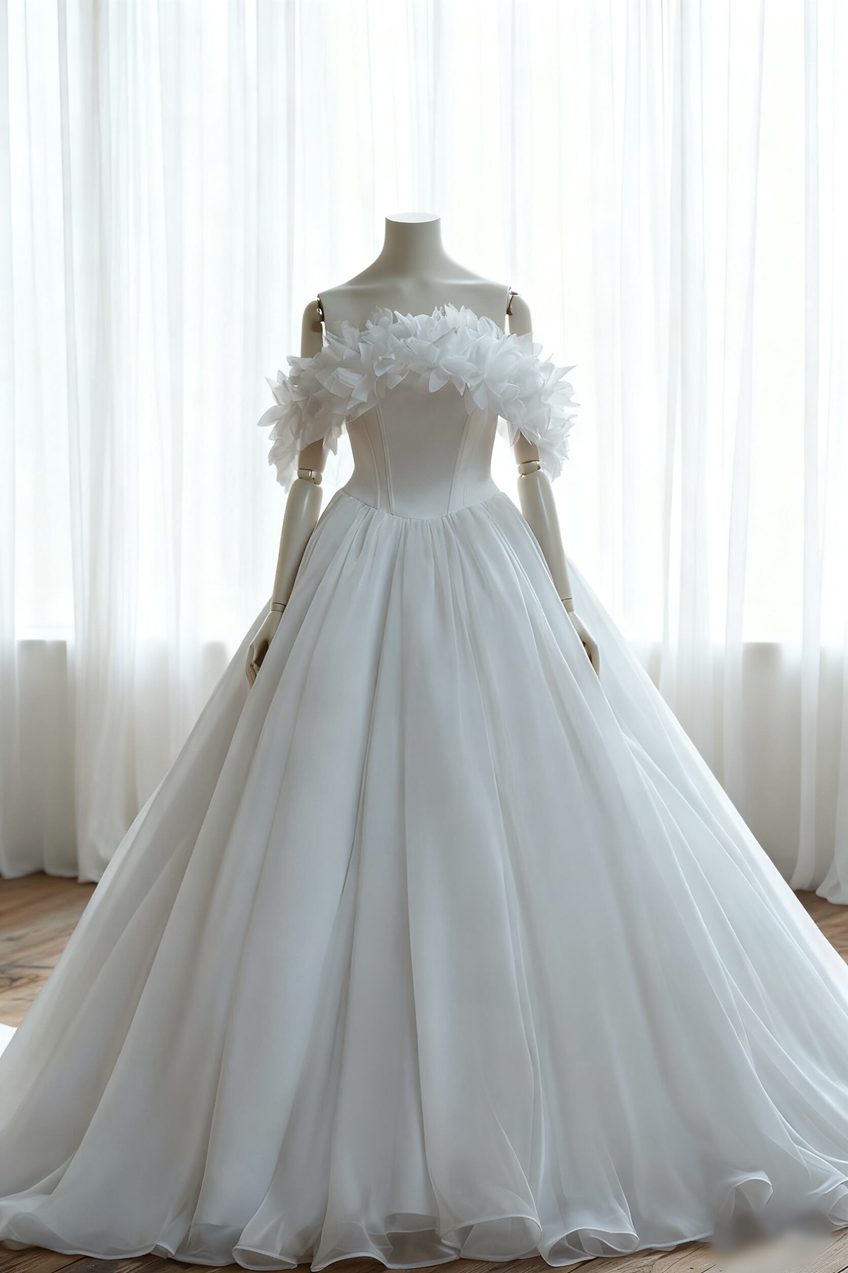 ウエディングドレス オフショルダー ラッフルフリル 楊柳オーガンジー 結婚式/披露宴 Aライン