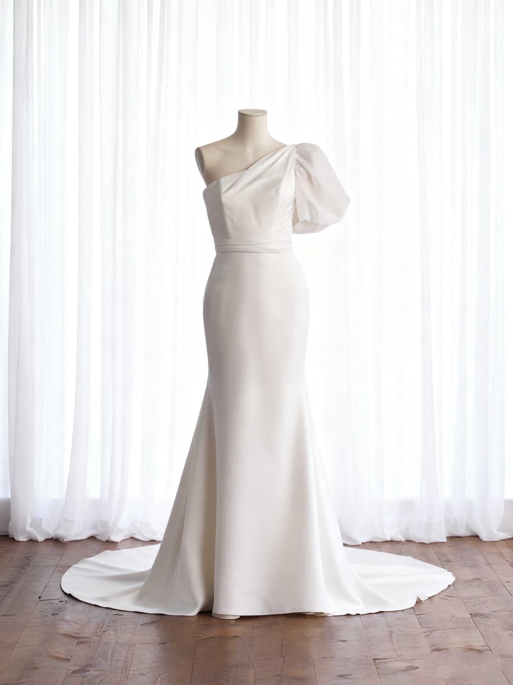 パーティードレス ワンショルダー ソフトマーメイドライン パフスリーブ クレープ生地 結婚式/披露宴 2次会
