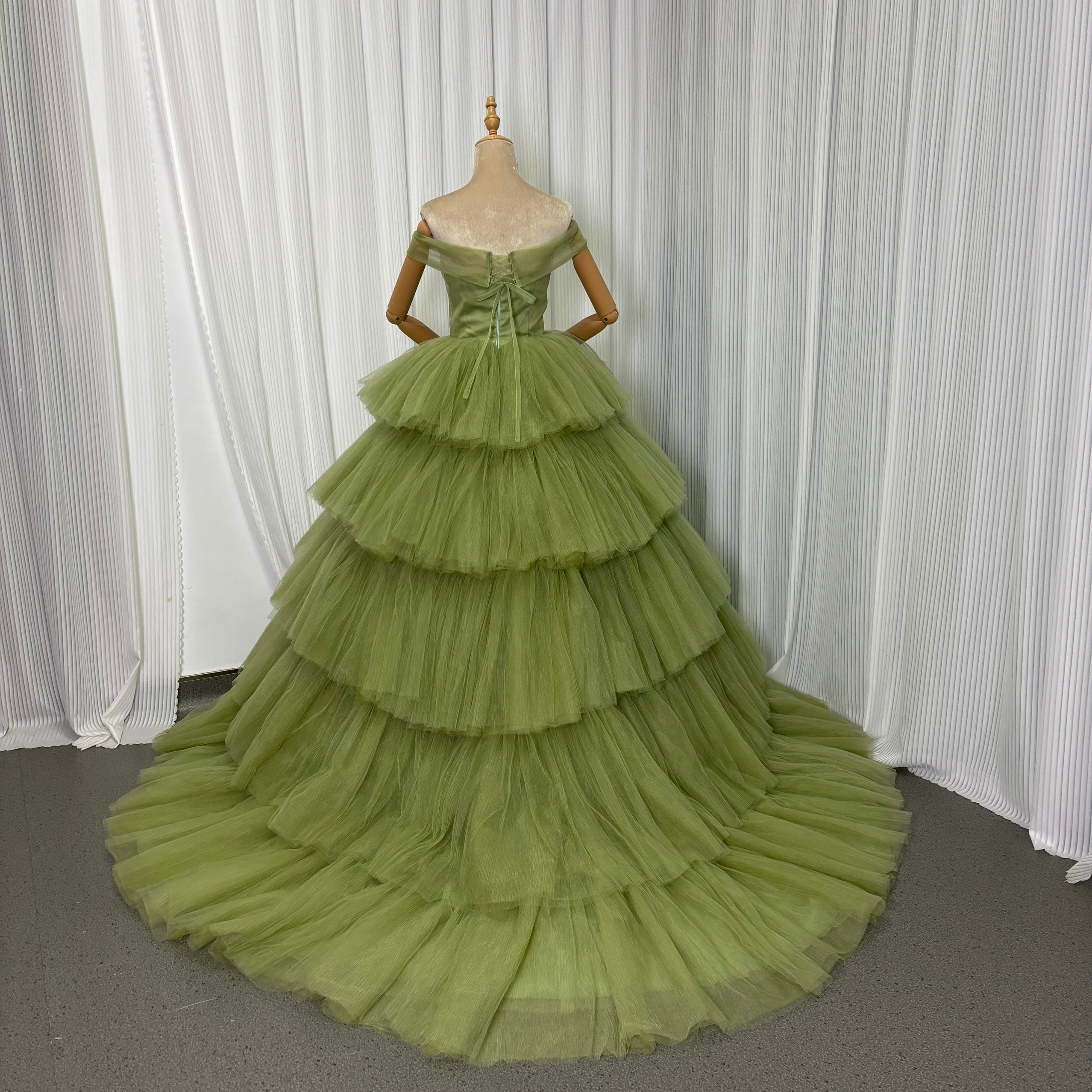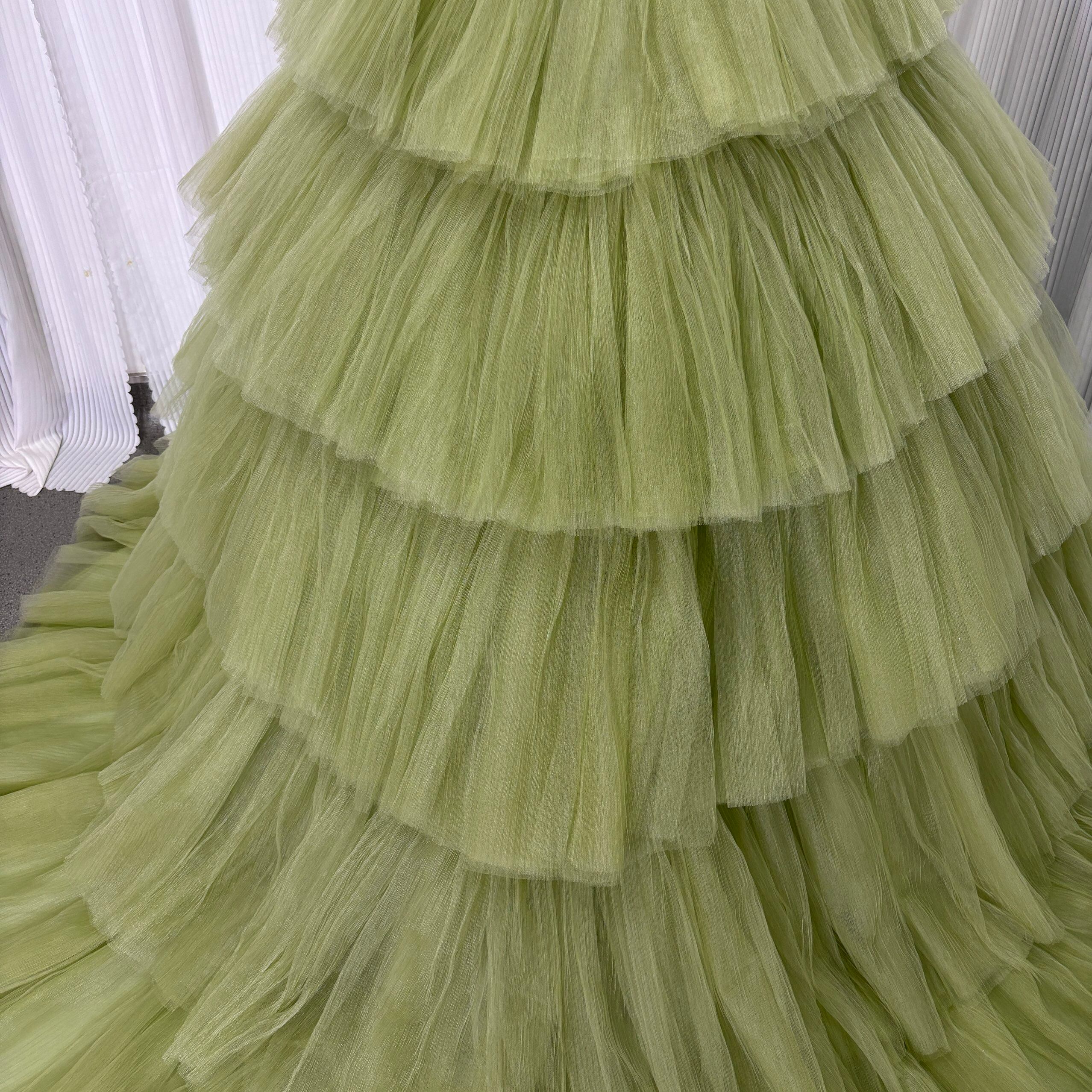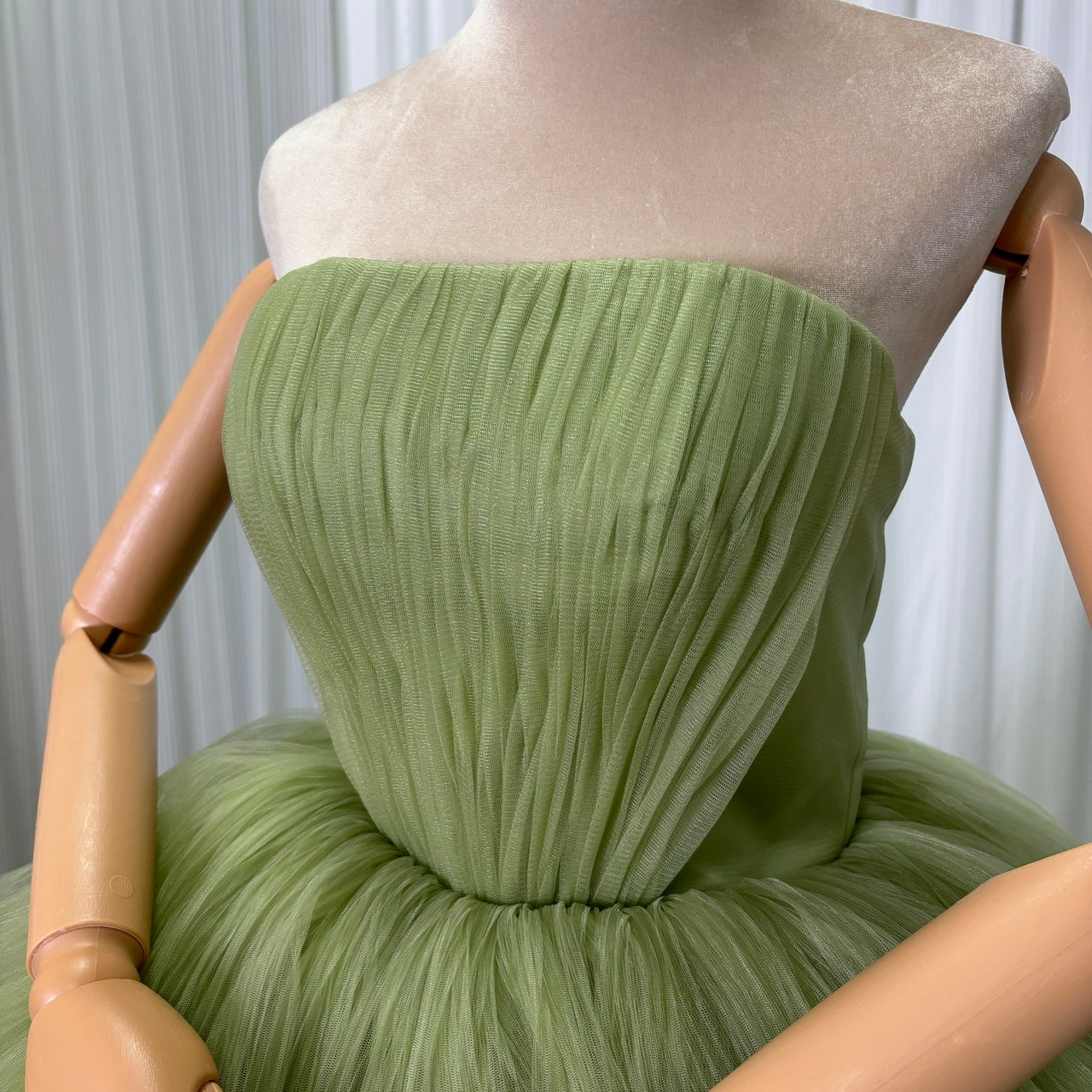 カラードレス プリーツドレス ティアードのドレス 取り外し可能なオフショルダー グリーン 結婚式