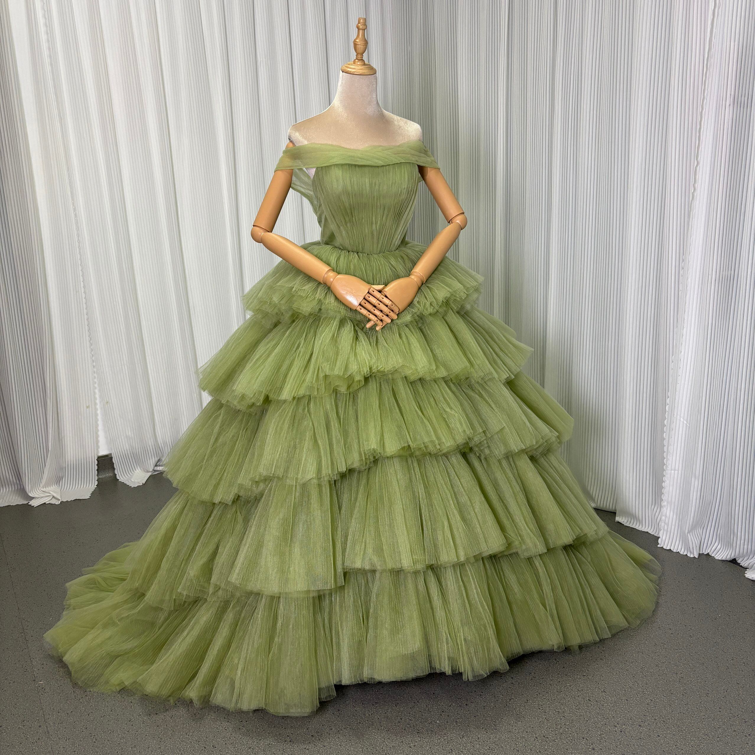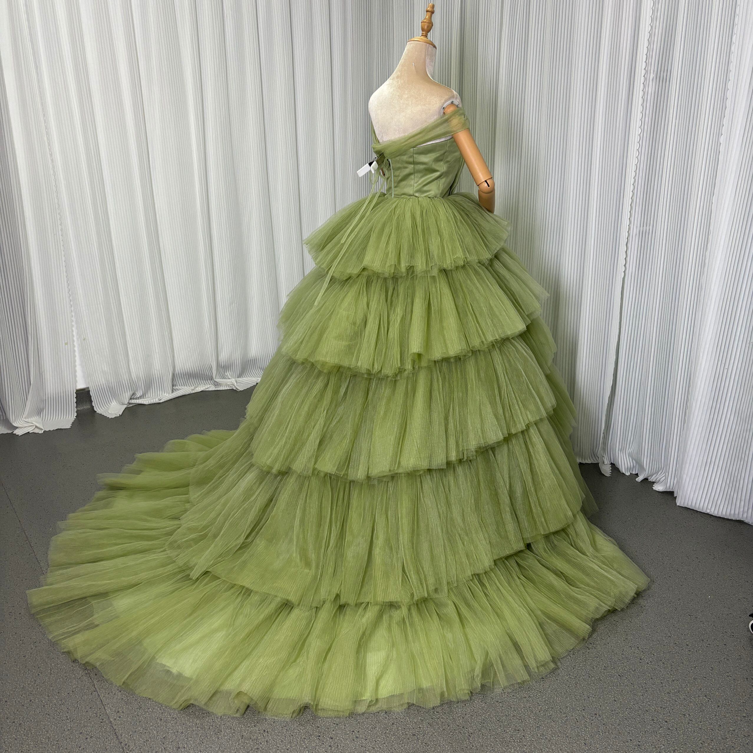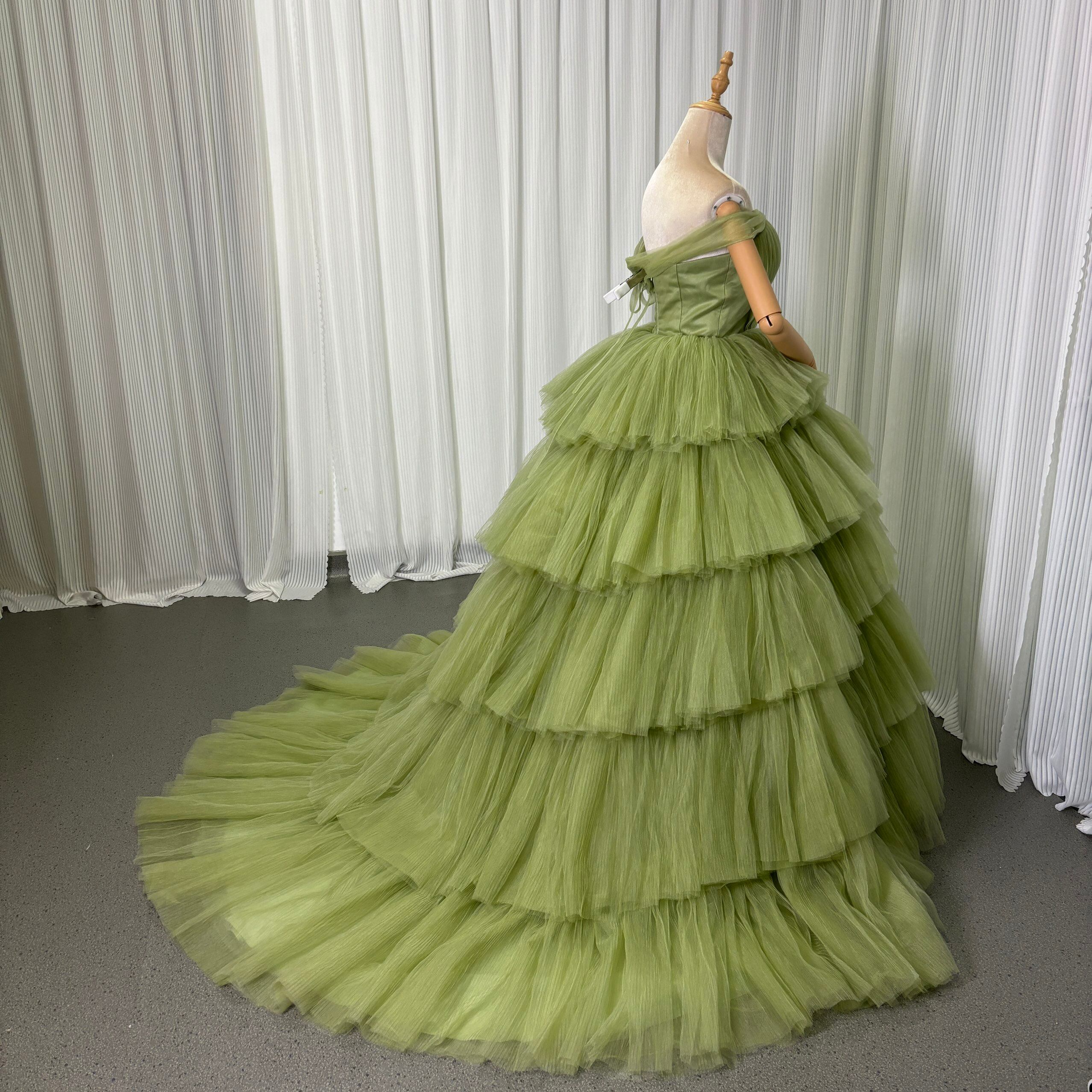 カラードレス プリーツドレス ティアードのドレス 取り外し可能なオフショルダー グリーン 結婚式