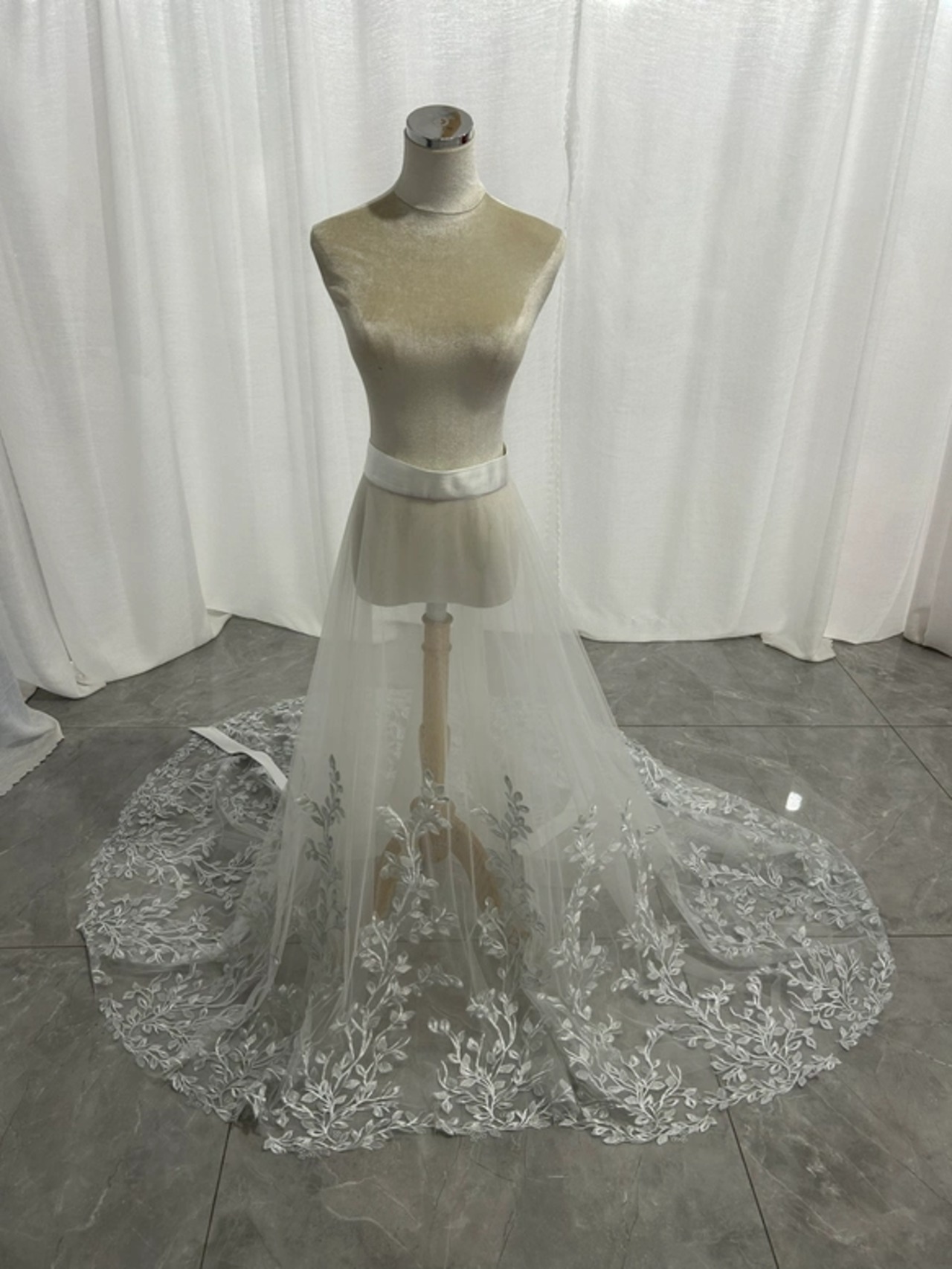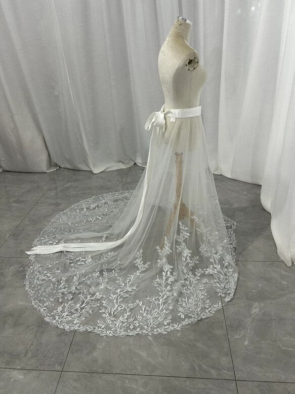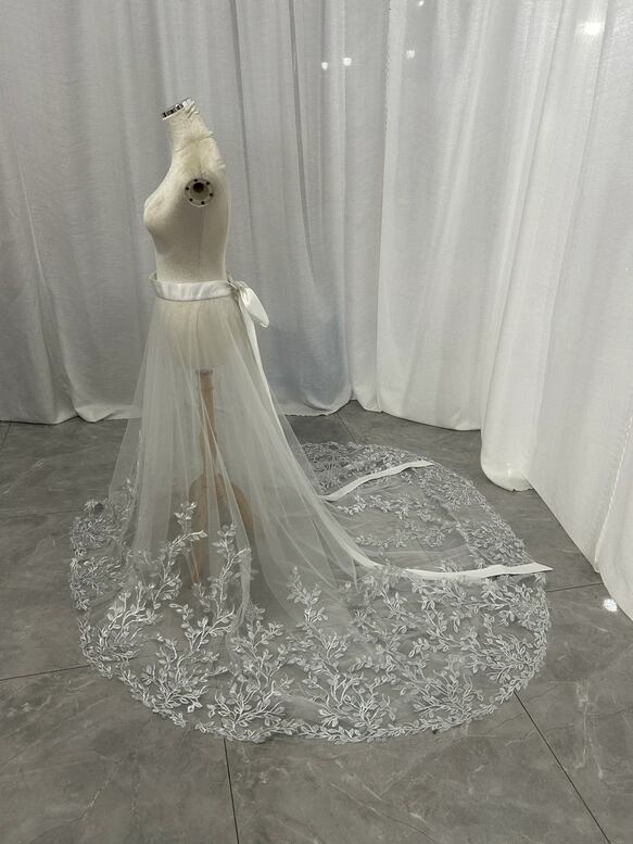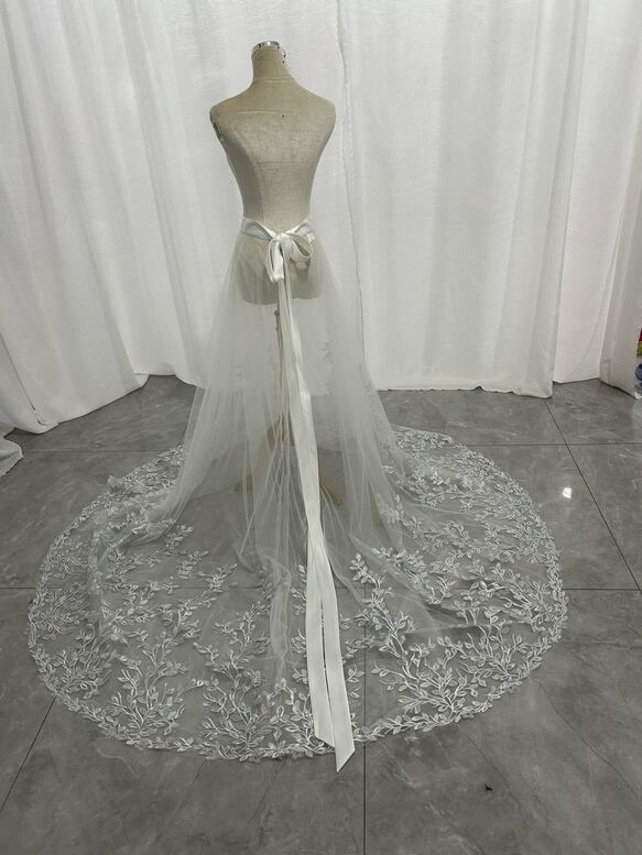 大人気上昇!ウエディングドレス チュールスカート 薄シルバー リーフ刺繍 華やかなトレーン 花嫁