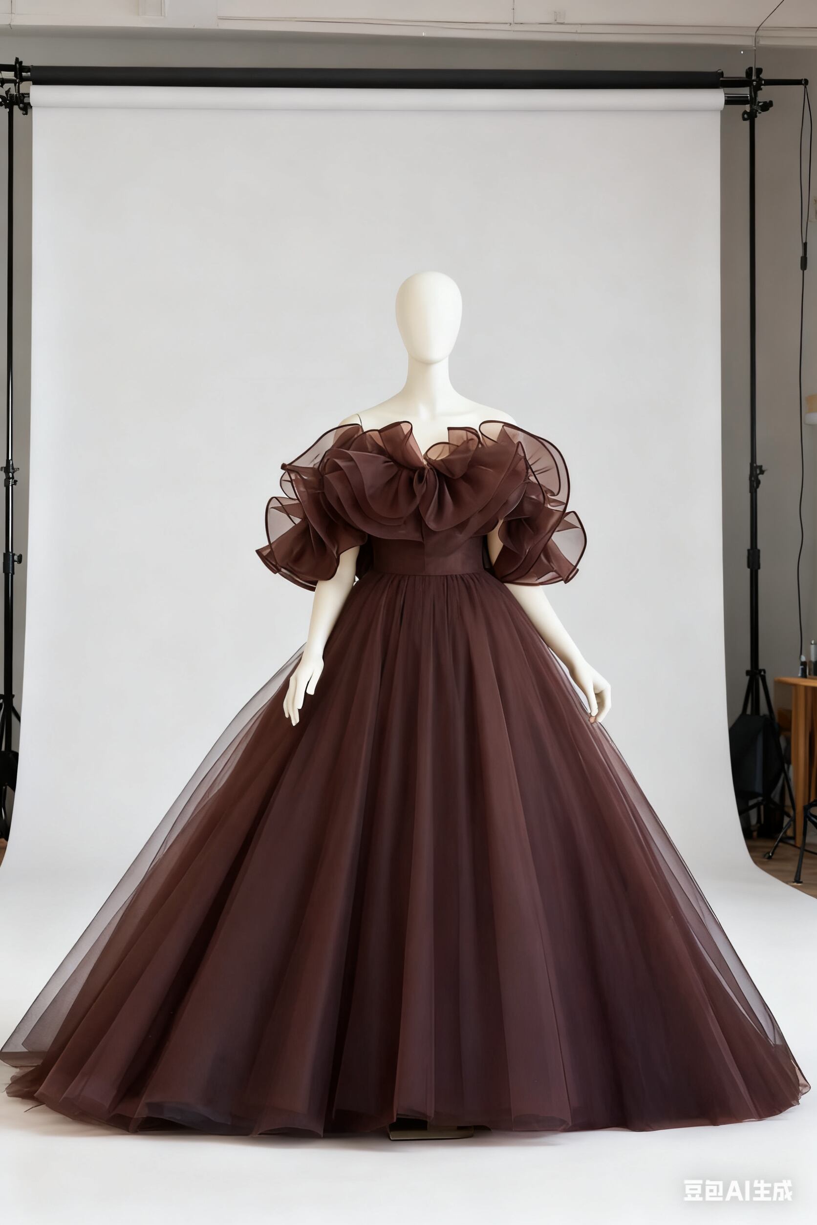 カラードレス ブラウン オフショルダー ラッフルフリル Aライン プリンセスライン チュールスカート ブライダル