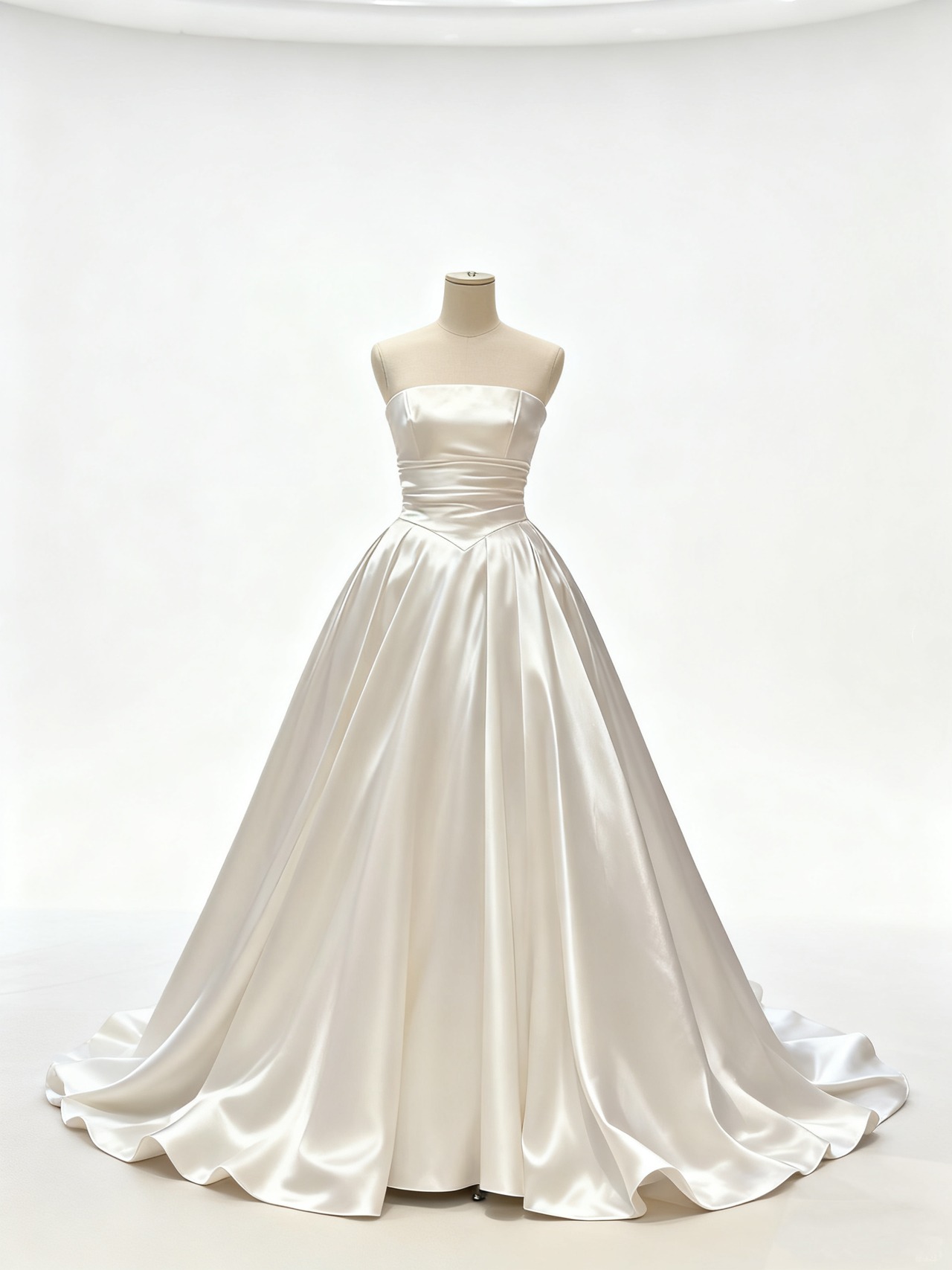 ウエディングドレス ベアトップ ハンドドレープ オフホワイト 光沢サテン 結婚式 前撮り Aライン