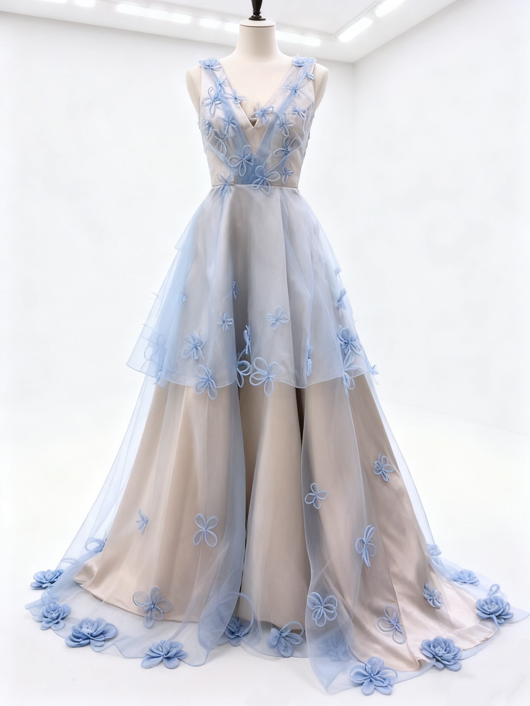 カラードレス 花モチーフ ノースリーブ ブルー 薄シャンパン色 プリンセスライン 結婚式 花嫁