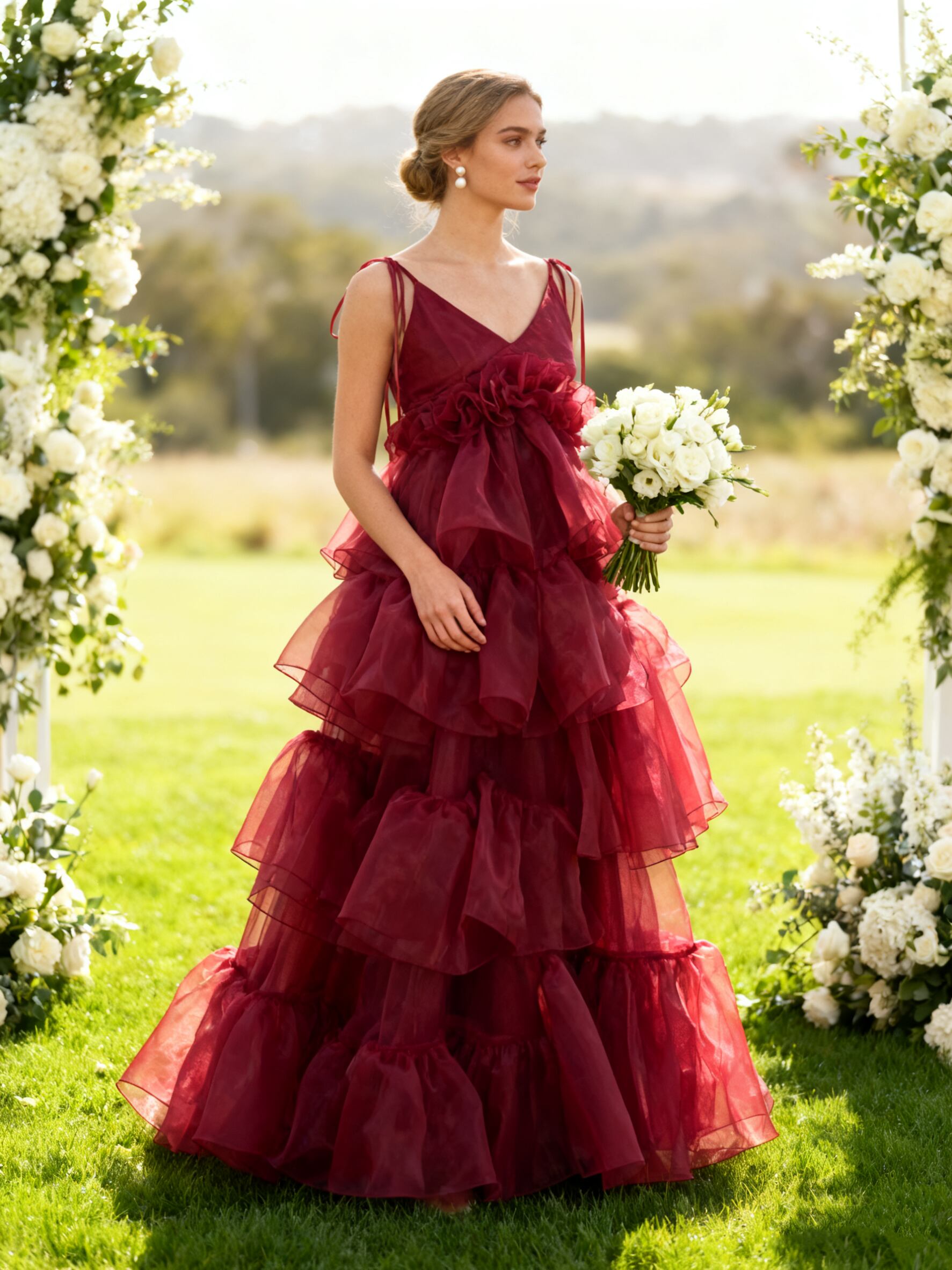 パーティードレス キャミソール Vネック 上質オーガンジー ワインレッド ロング アシンメトリードレス
