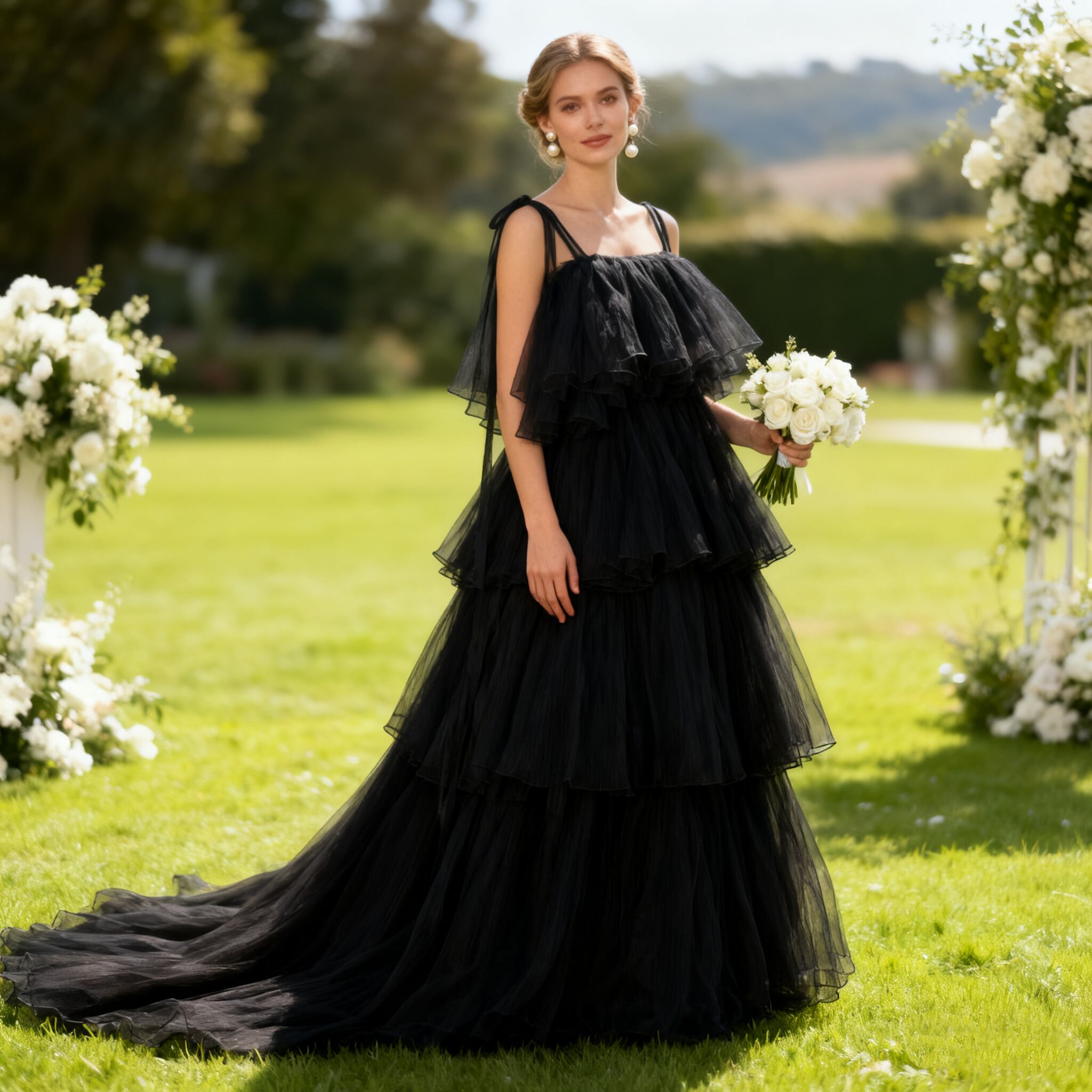 カラードレス キャミソール ブラック ティアードのドレス プリーツスカート トレーン エレガント 前撮り