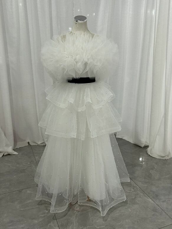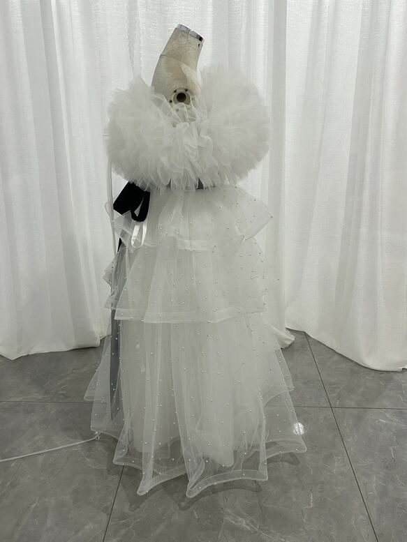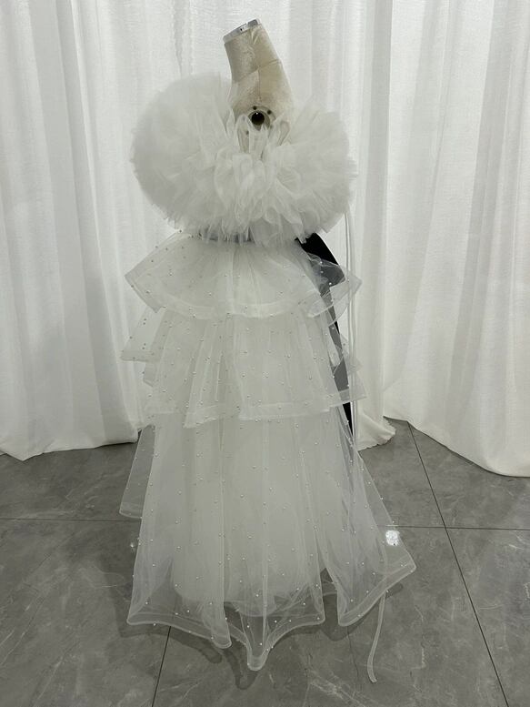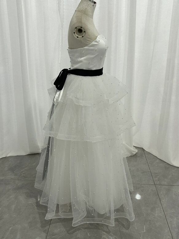 パーティードレス オフホワイト ラッフルフリル オフショルダー パール ベルト 編み上げ エレガント