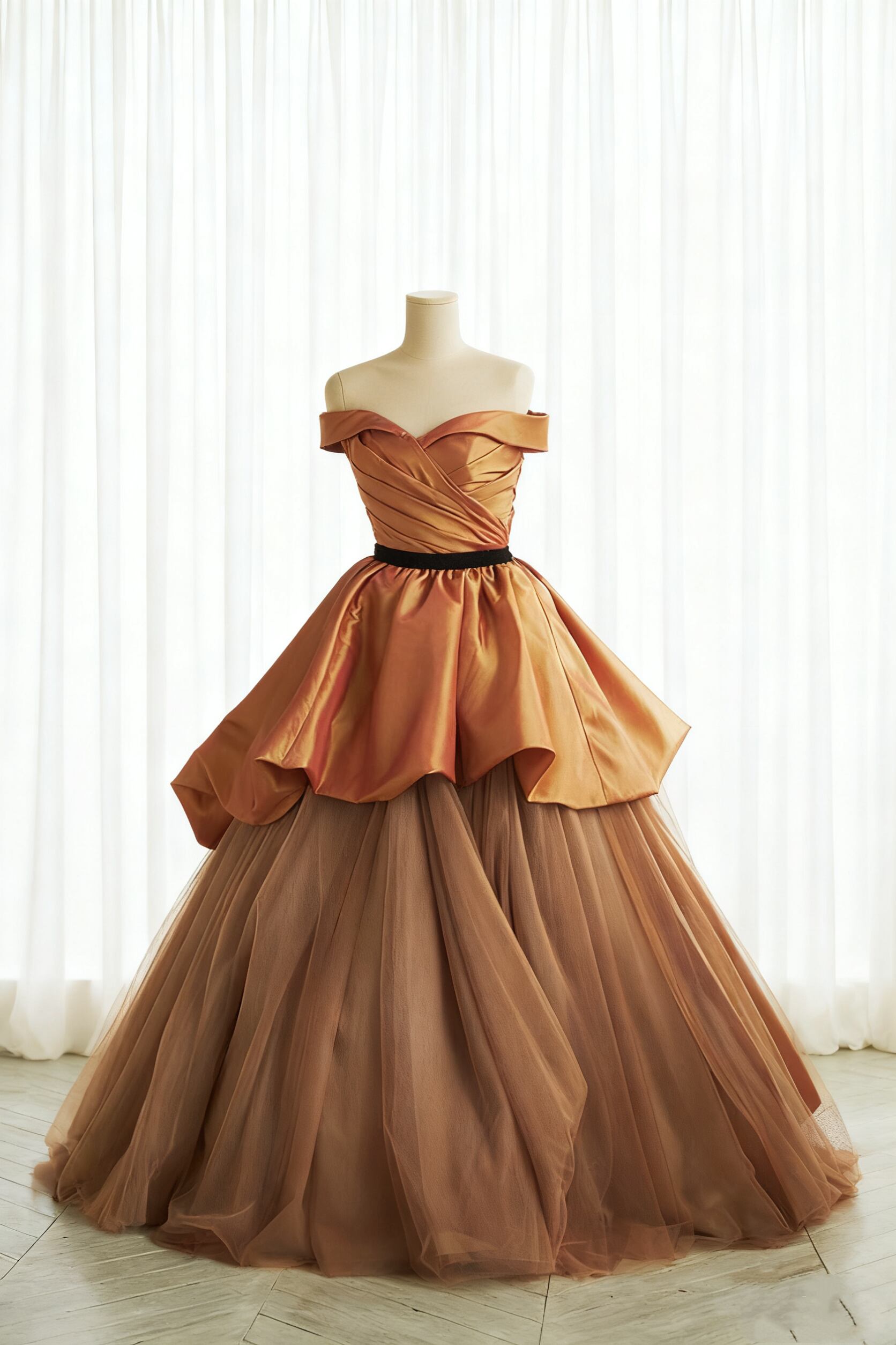 カラードレス オレンジ オフショルダー ハンドドレープ ラッフルフリル チュールスカート 結婚式/披露宴