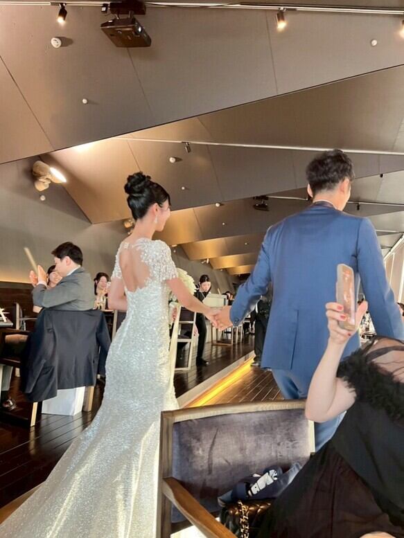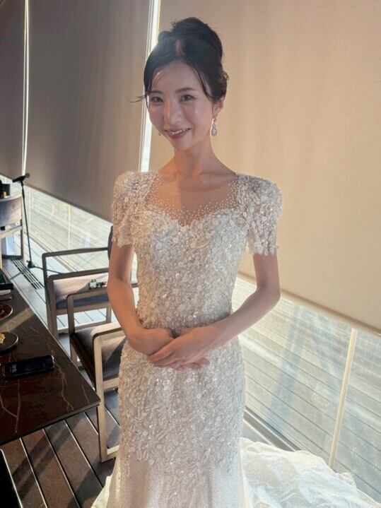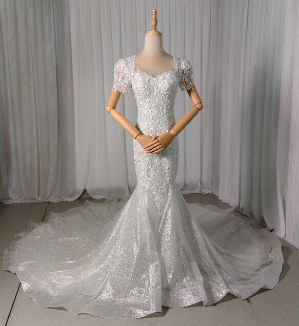実例写真!ウェディングドレス 半袖 編み上げ 韓国風ドレス ビジュー マーメイド トレーン 結婚式 バックレス