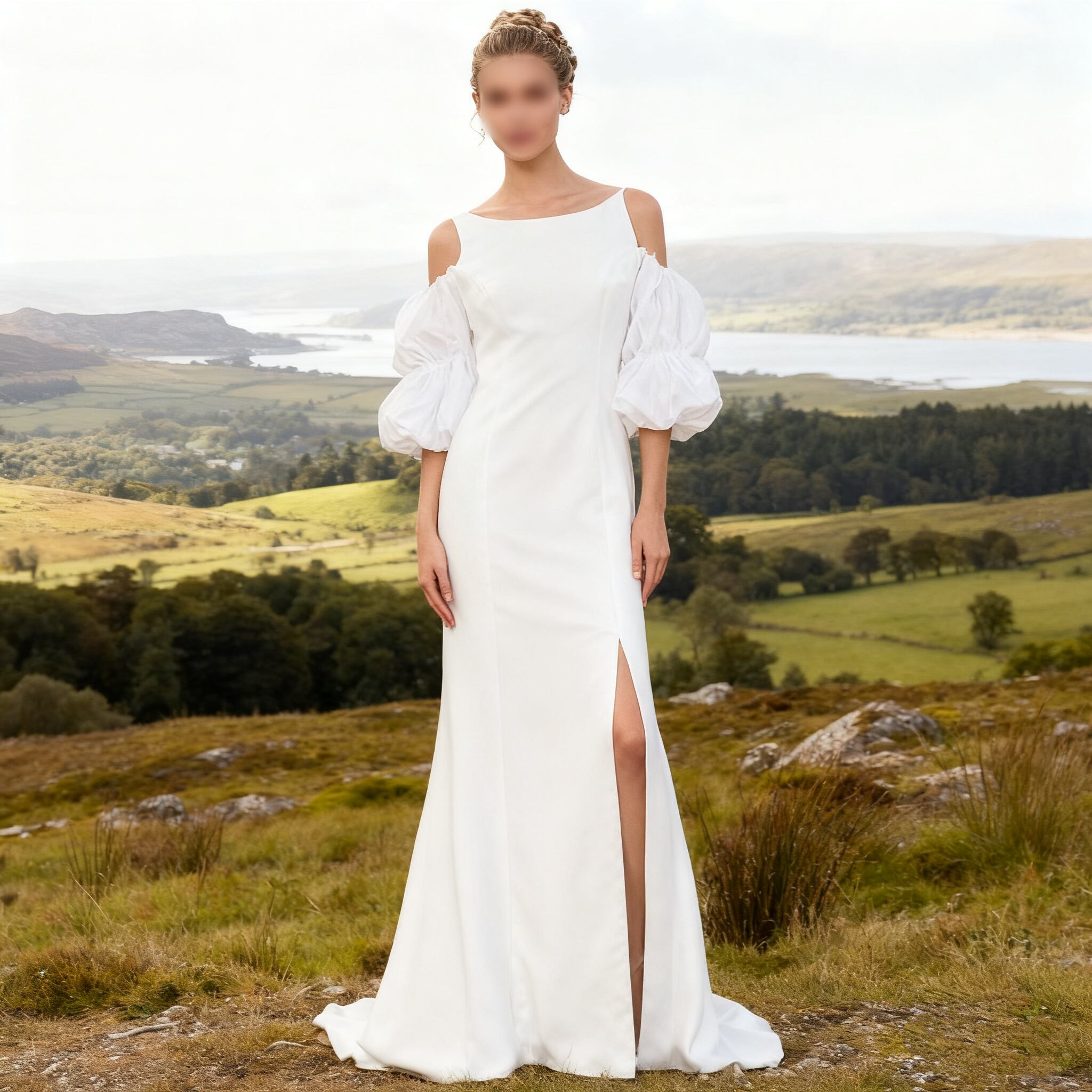 パーティードレス パフスリーブ フロントスリット ボートネック マーメイドライン 前撮り 花嫁