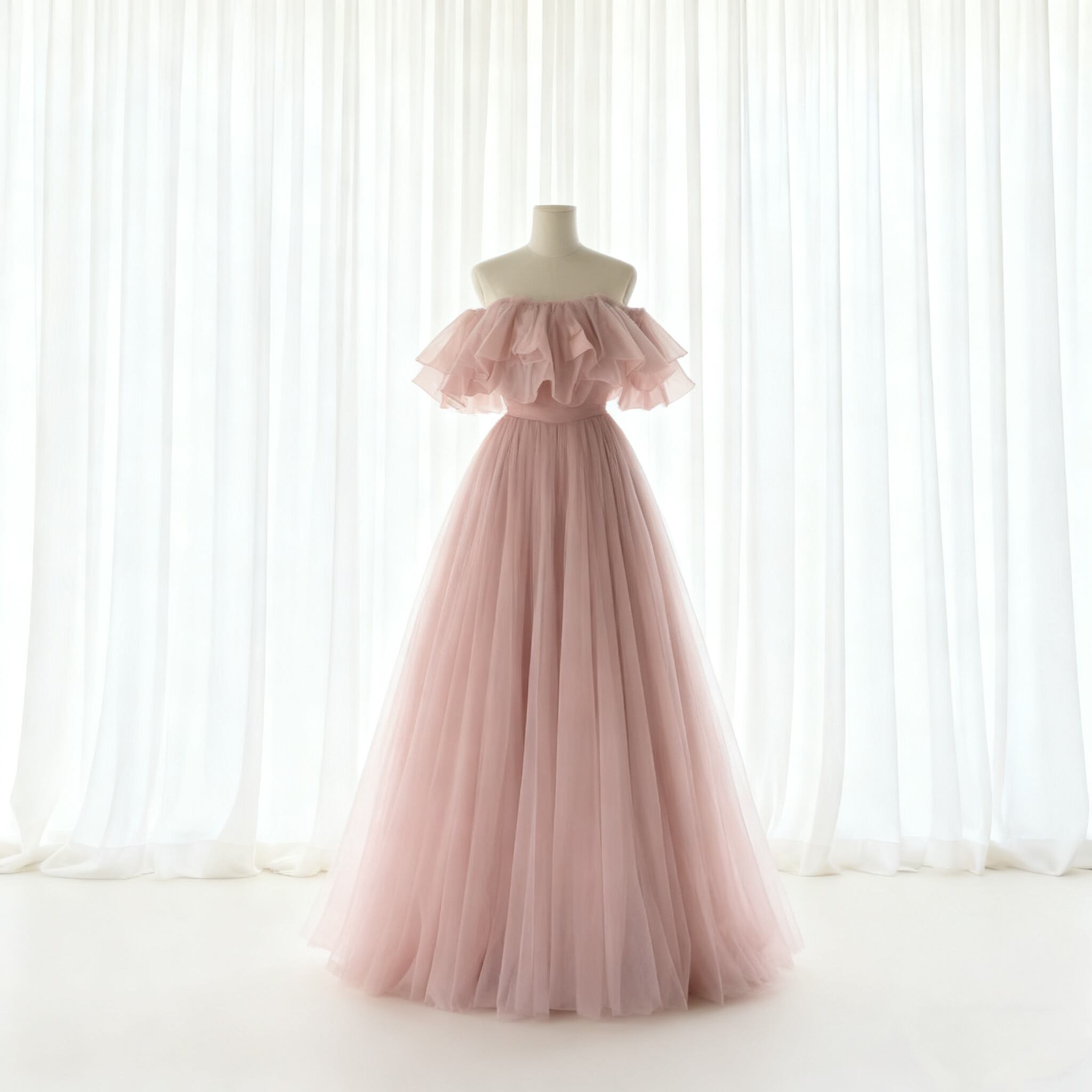カラードレス ピンク オフショルダー チュールスカート スレンダーライン Aライン 結婚式/披露宴