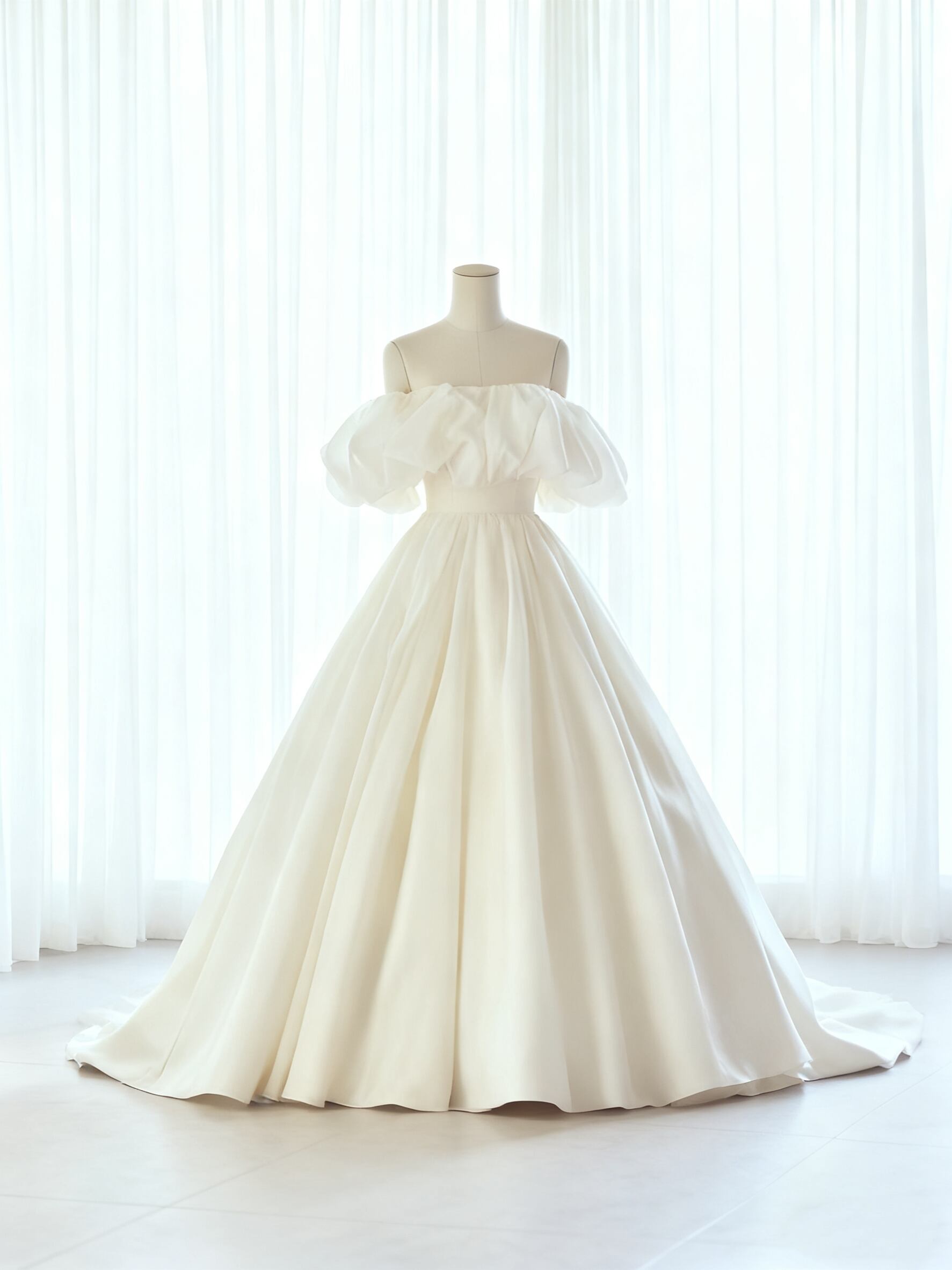 ウエディングドレス オフホワイト オフショルダー チュールスカート スレンダーライン Aライン 結婚式/披露宴