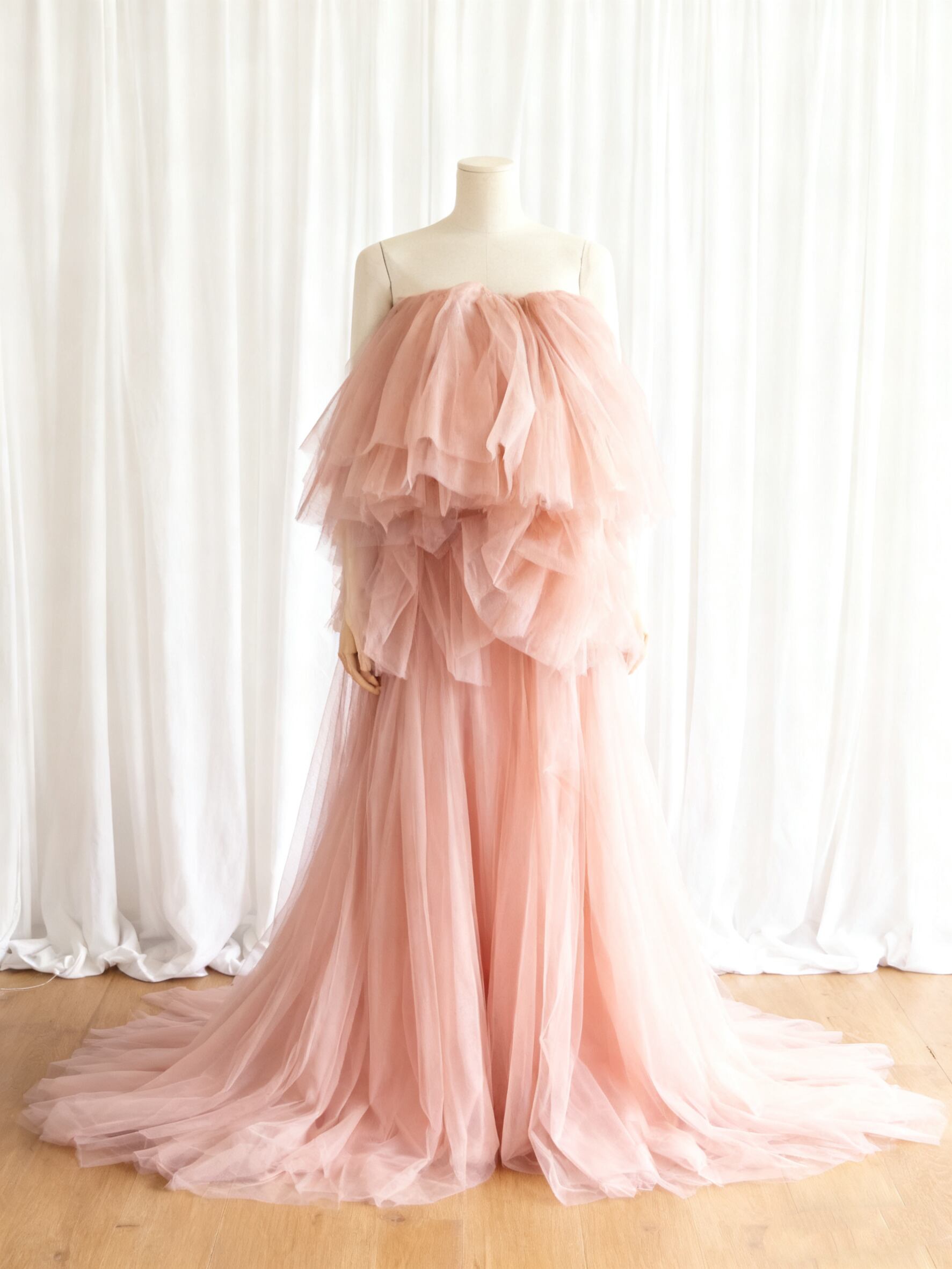 カラードレス コーラルピンク ビスチェドレス ふわふわドレス 柔らかく重ねたチュールスカート 前撮り