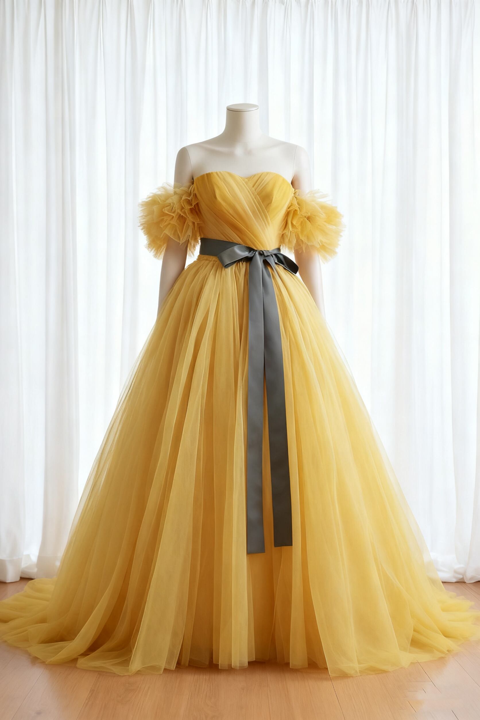 カラードレス イエロー サッシュベルト フリル袖 柔らかく重ねたチュールスカート 結婚式 プリンセスライン