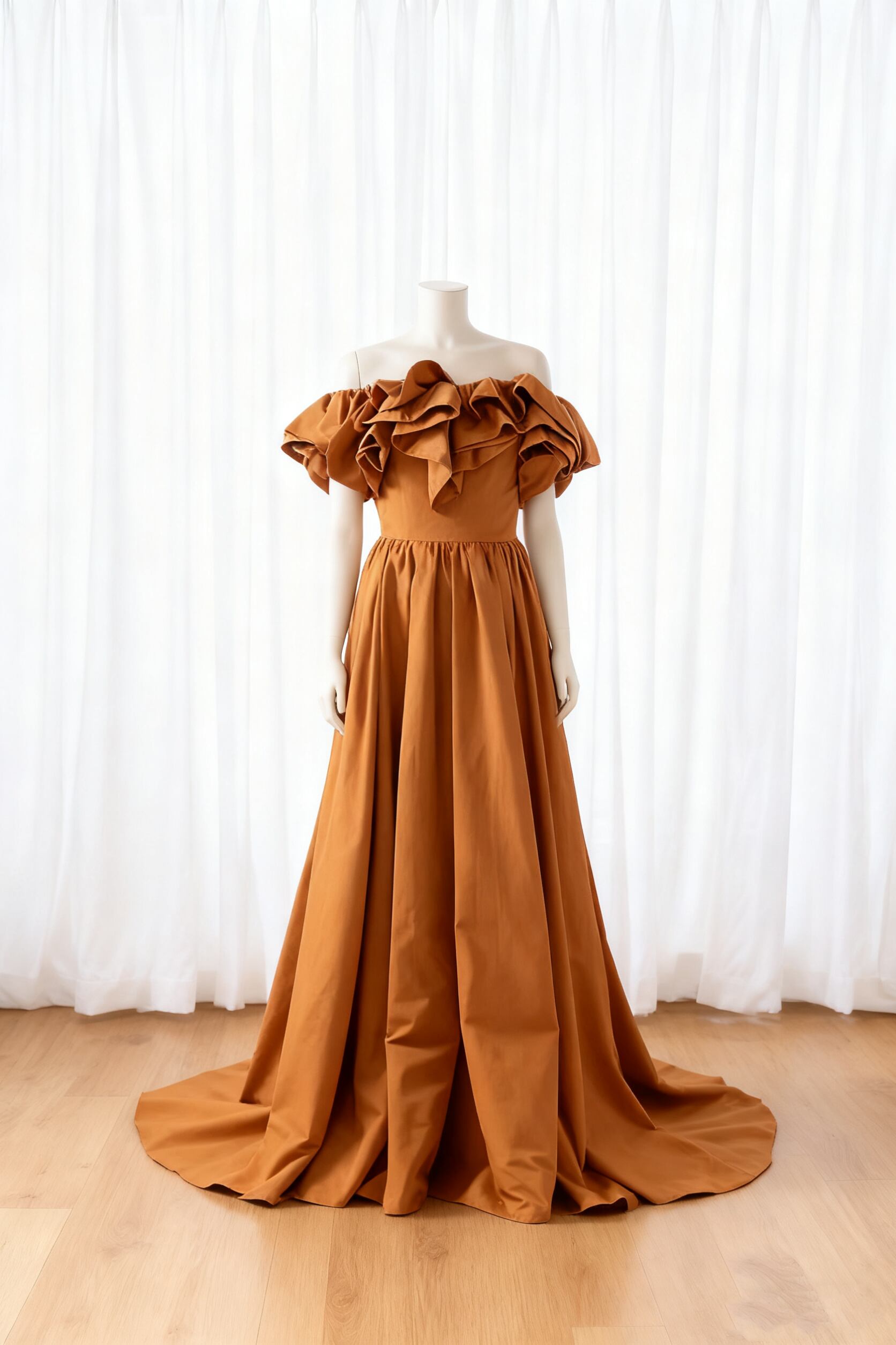 カラードレス パーティードレス オレンジ 花嫁 オフショルダー フリルドレス ピアノ演奏会/音楽会 床付く