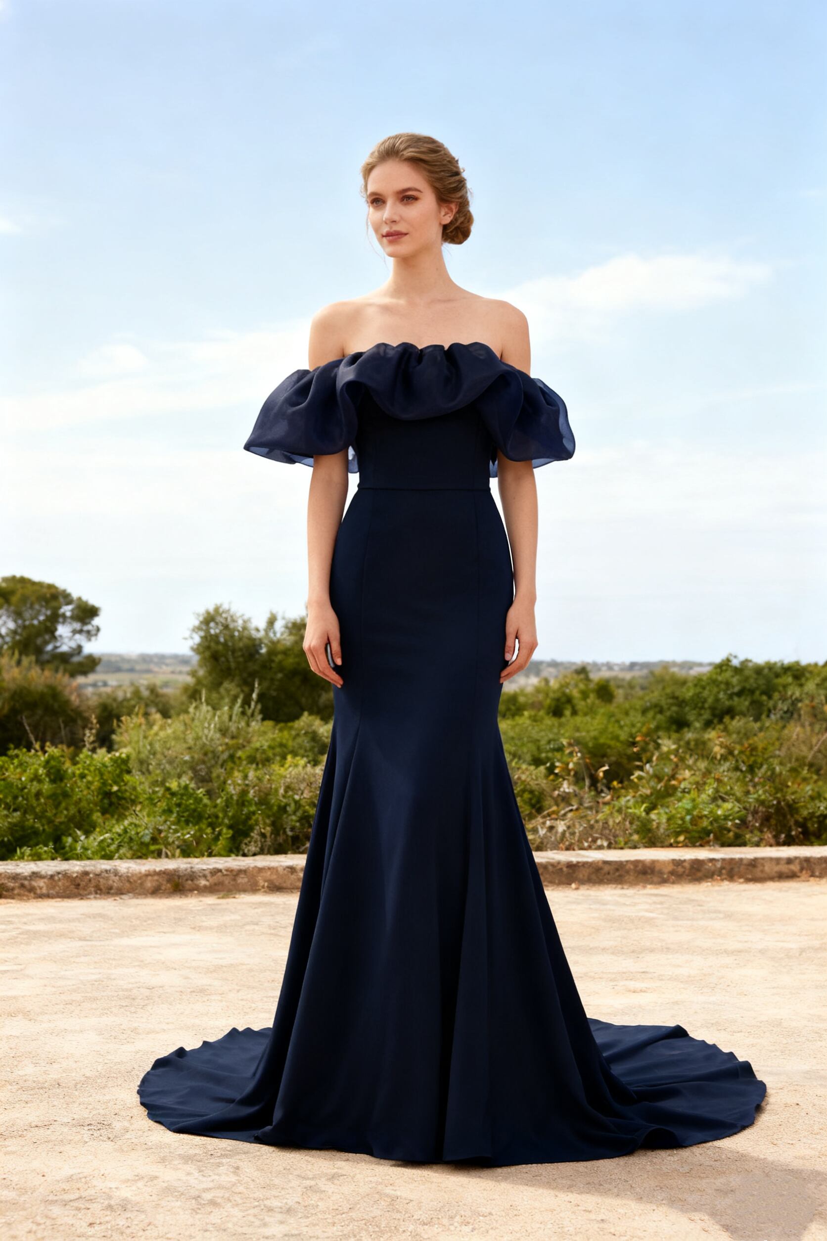 パーティードレス ネイビー オフショルダー マーメイド クレープ生地 楊柳オーガンジー 優雅なシルエット オーダーメイド可能