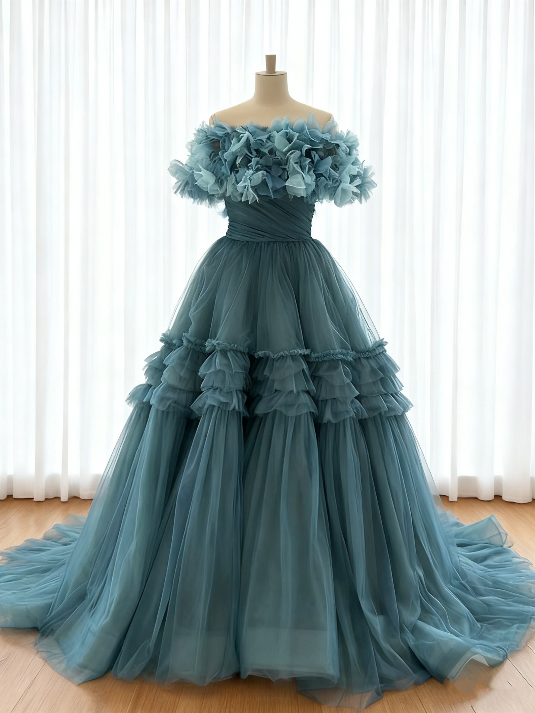 カラードレス オフショルダー 爽やかで優しいブルー 結婚式 プリンセスライン フリルドレス ブライダル