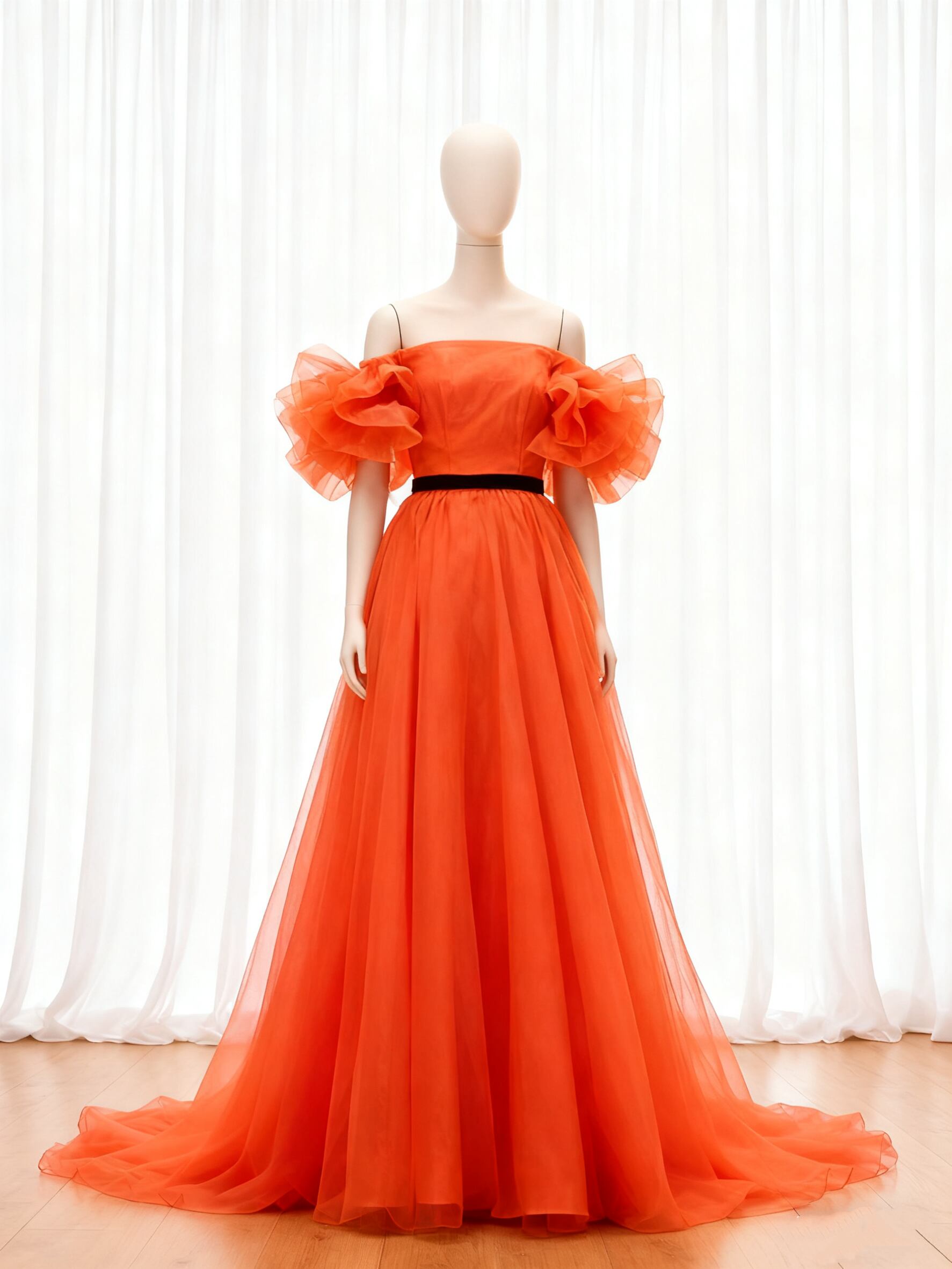 カラードレス オレンジ フリル袖 Aライン サッシュベルト 抜群におしゃれ度が際立つ 花嫁