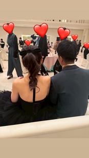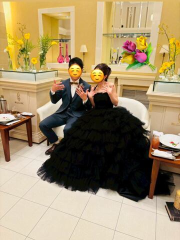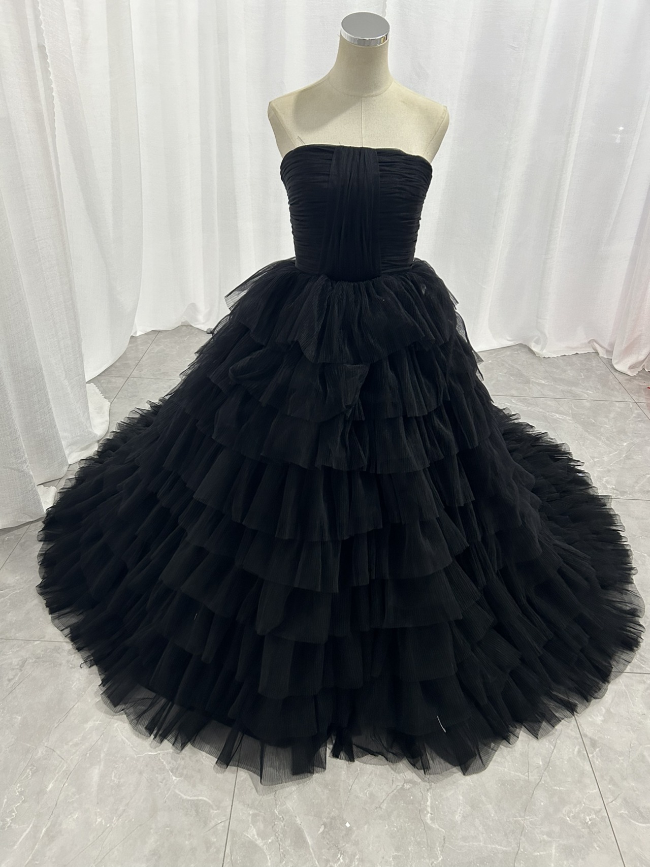 実例写真!オフショルダーカラードレス ブラックボリュームチュールドレス トレーン 編み上げ ビスチェタイプ