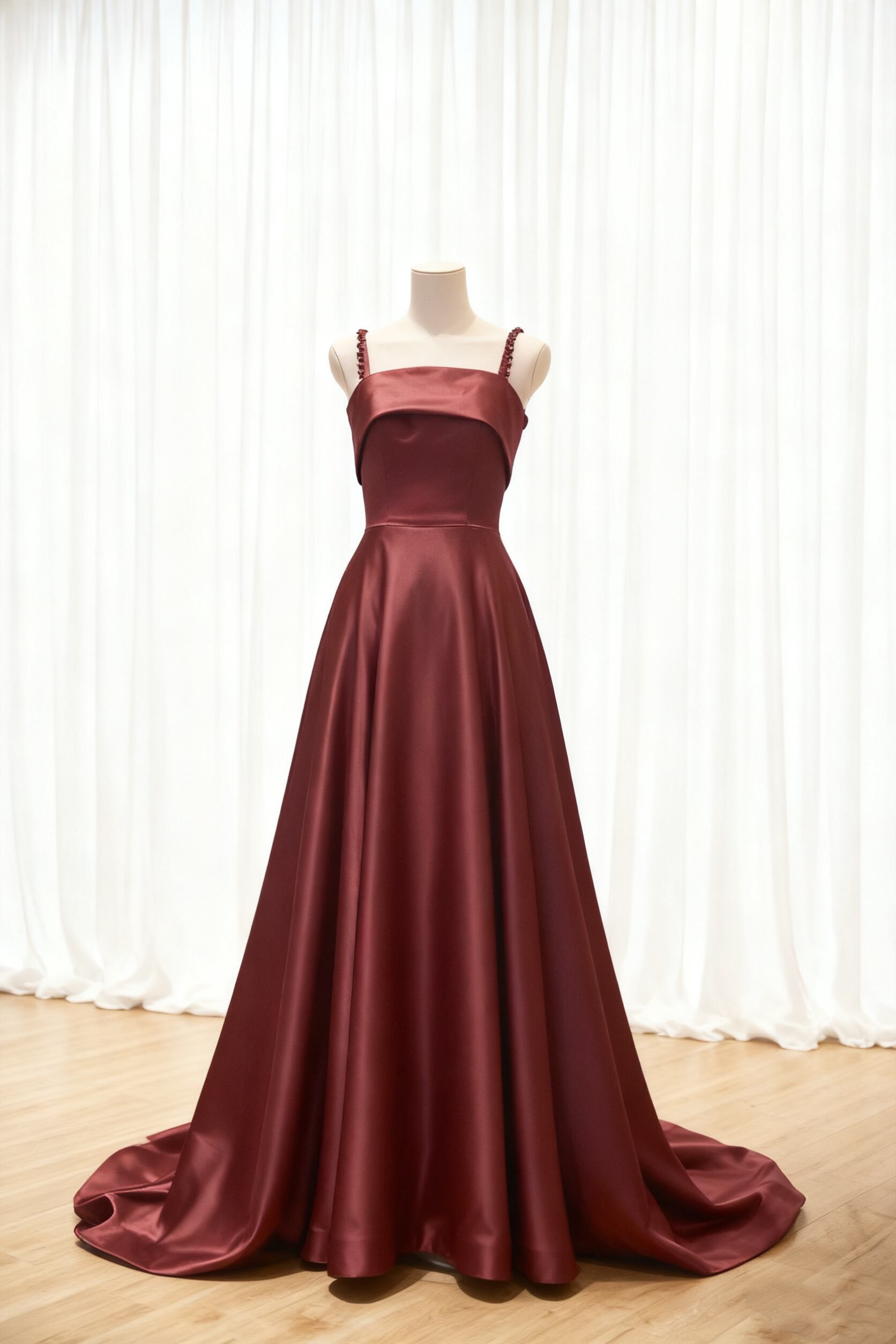 パーティードレス キャミソール スクエアネック ワインレッド 細見えシルエット 光沢サテン 前撮り