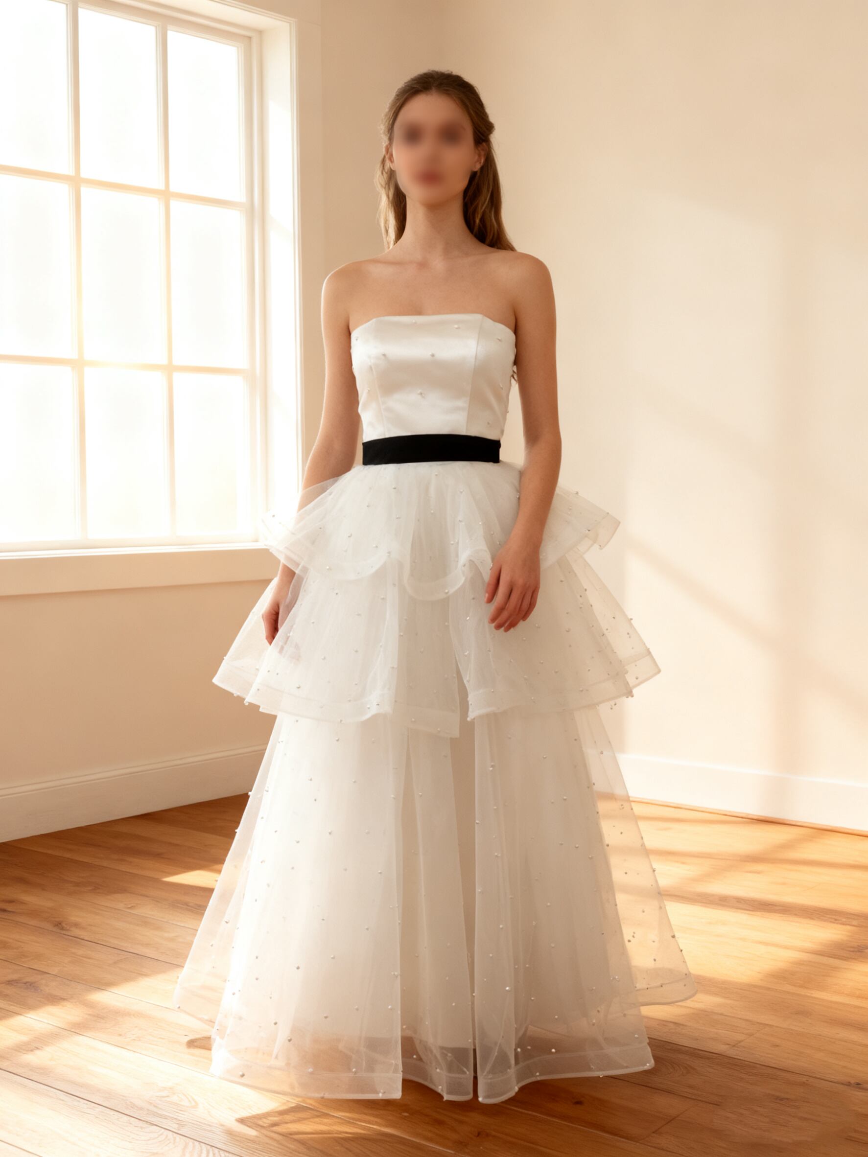 パーティードレス パール ビスチェドレス サッシュベルト 床付く ティアードのドレス 結婚式 前撮り