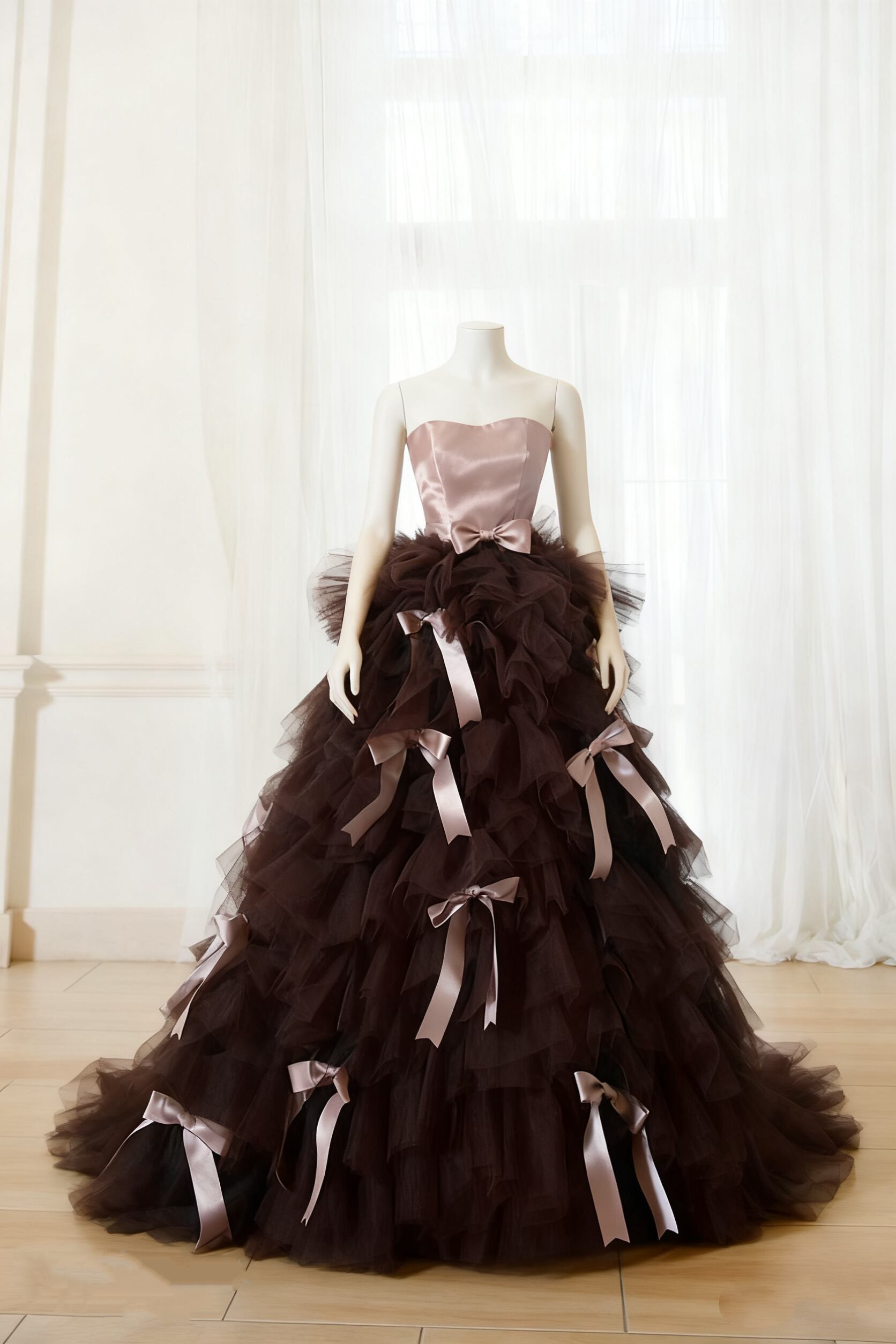 カラードレス ブラウン プリンセスライン リボン ビスチェドレス ふわふわドレス /結婚式/披露宴