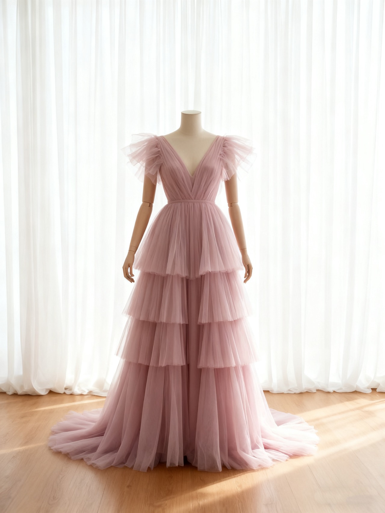 カラードレス ピンク ティアードのドレス Vネックドレス フリル袖 ピアノ演奏会/音楽会