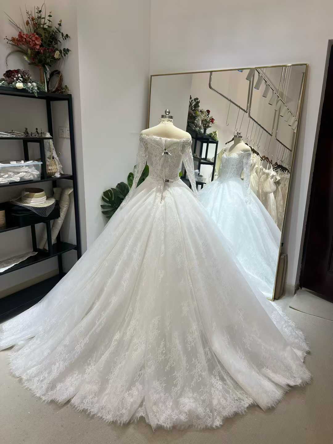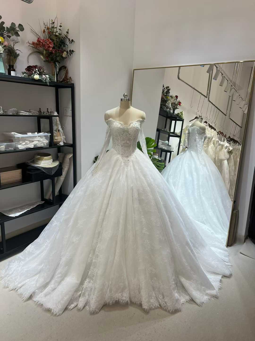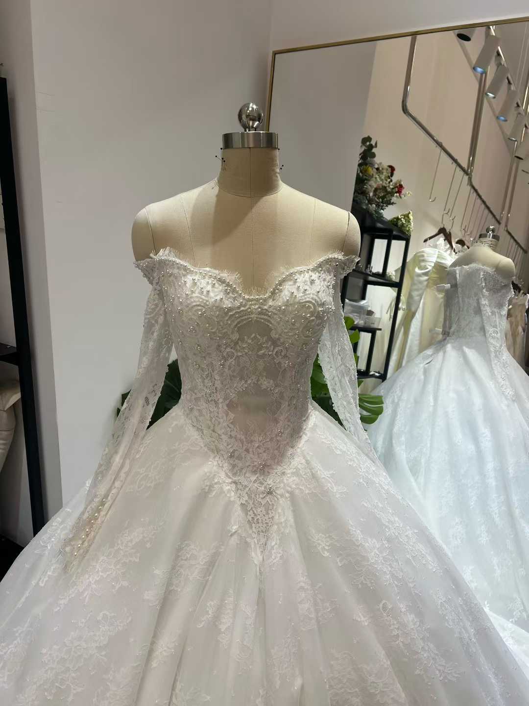 ウエディングドレス オフショルダー ロングスリーブ 贅沢な総レース フレアスカート パール 結婚式