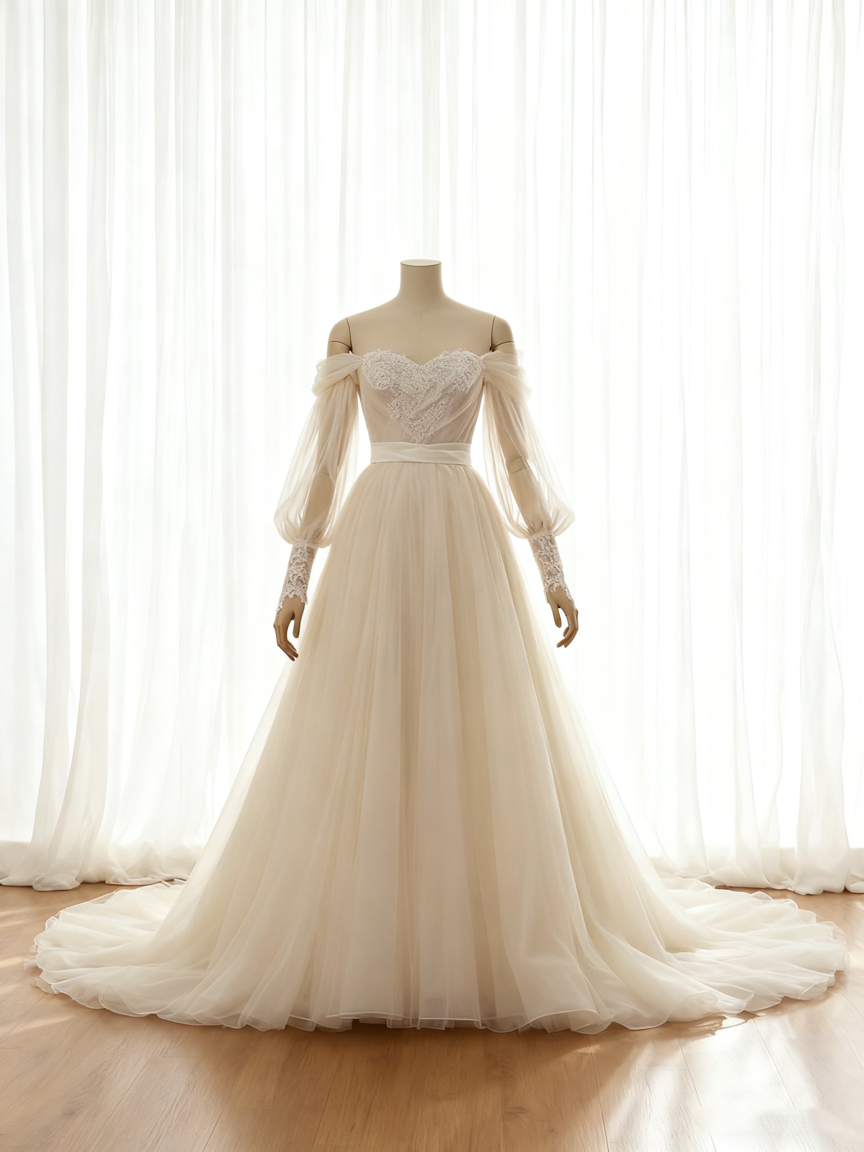 ウエディングドレス 長袖 パフスリーブ 上品な花レース オフショルダー チュールスカート 結婚式 アイボリー