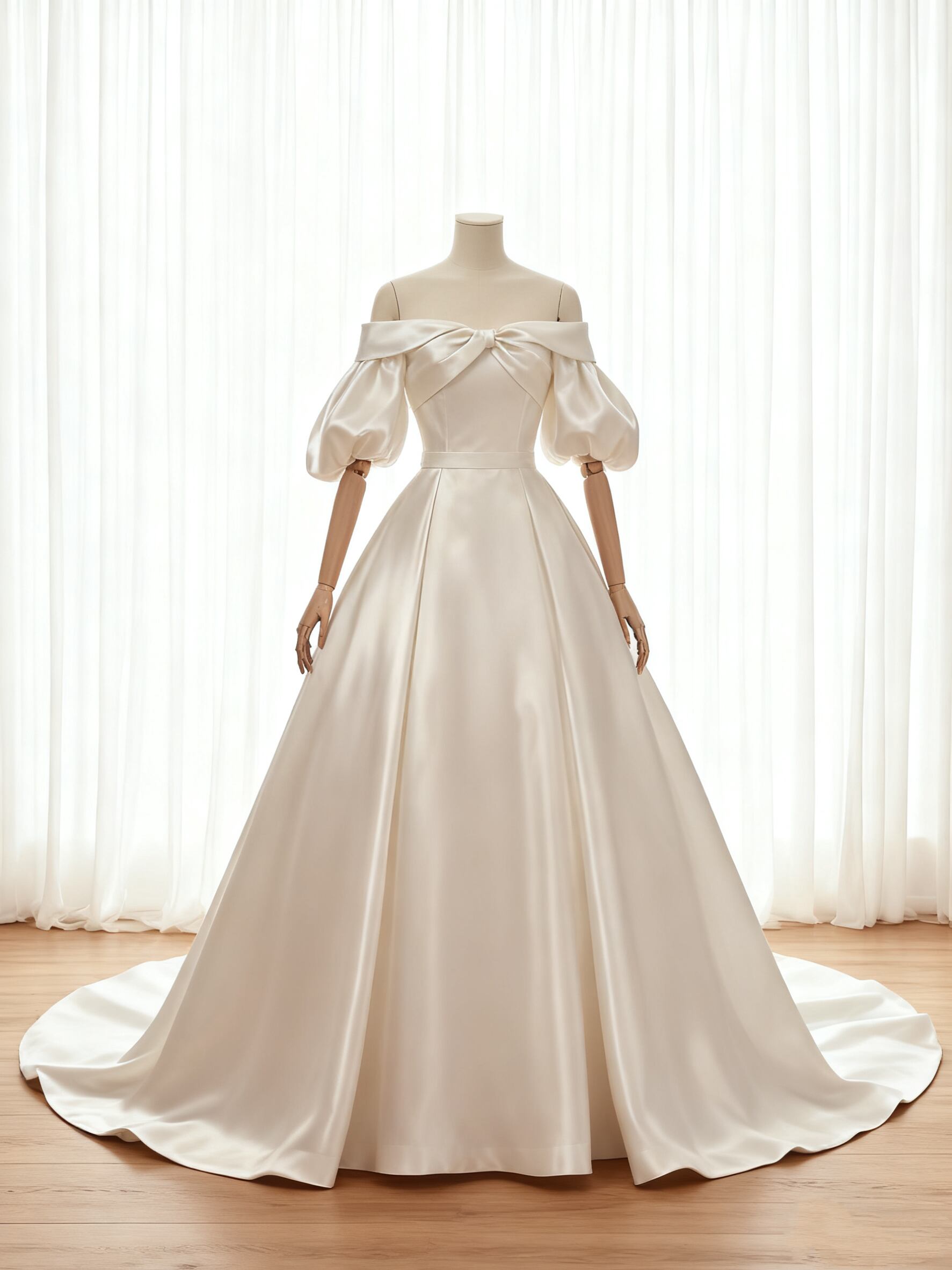 ウェディングドレス パフスリーブ オフショルダー 光沢サテン ハンドドレープ結婚式 光沢サテン