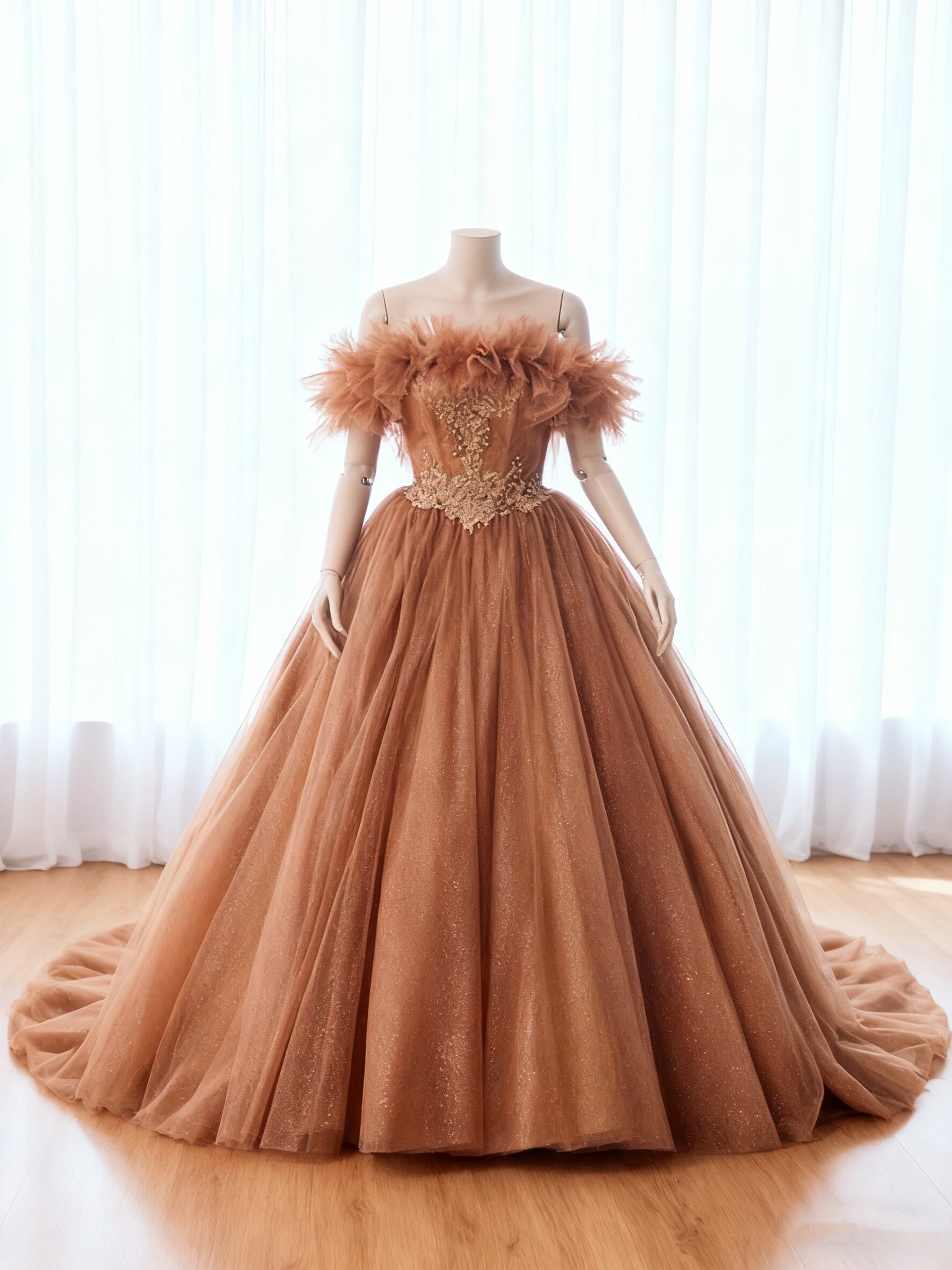 カラードレス テラコッタ色 オフショルダー 3D立体レース刺繍 キラキラドレス 花嫁 ふわふわドレス