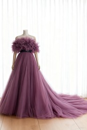カラードレス パープル オフショルダー サッシュベルト 柔らかく重ねたチュールスカート ブライダル 花嫁