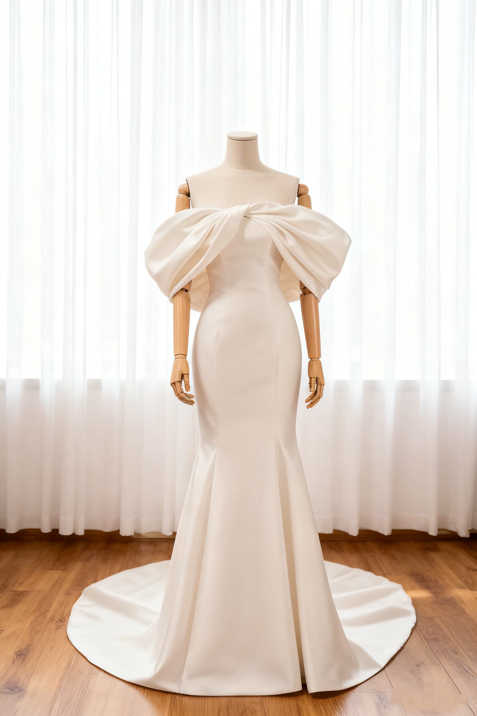 パーティードレス オフショルダー 姫袖 マーメイドライン オフホワイト 結婚式/披露宴 優雅なシルエット