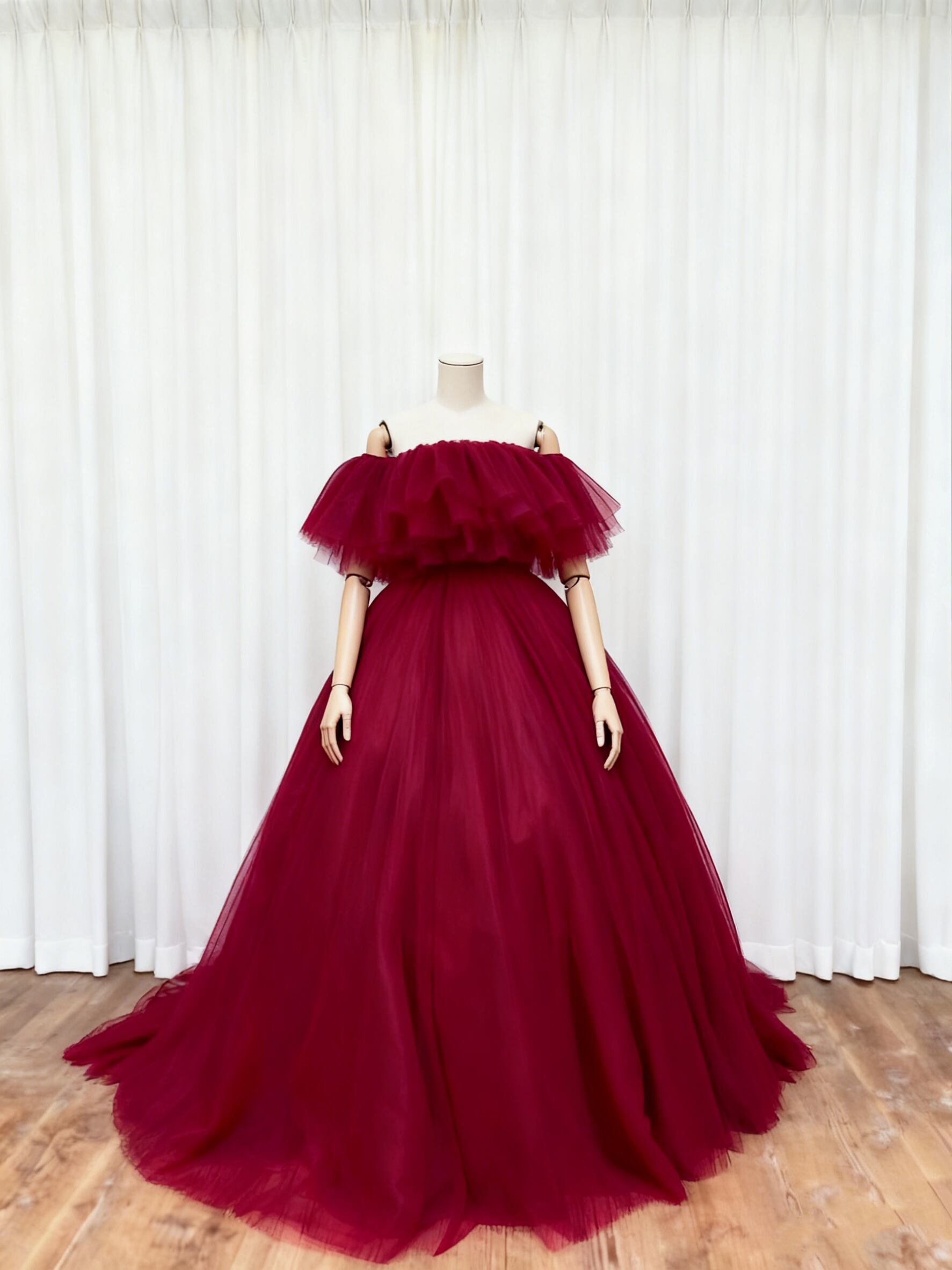 カラードレス オフショルダー ビビッドピンク 柔らかく重ねたチュールスカート フレアスカート 前撮り 抜群におしゃれ度が際立つ