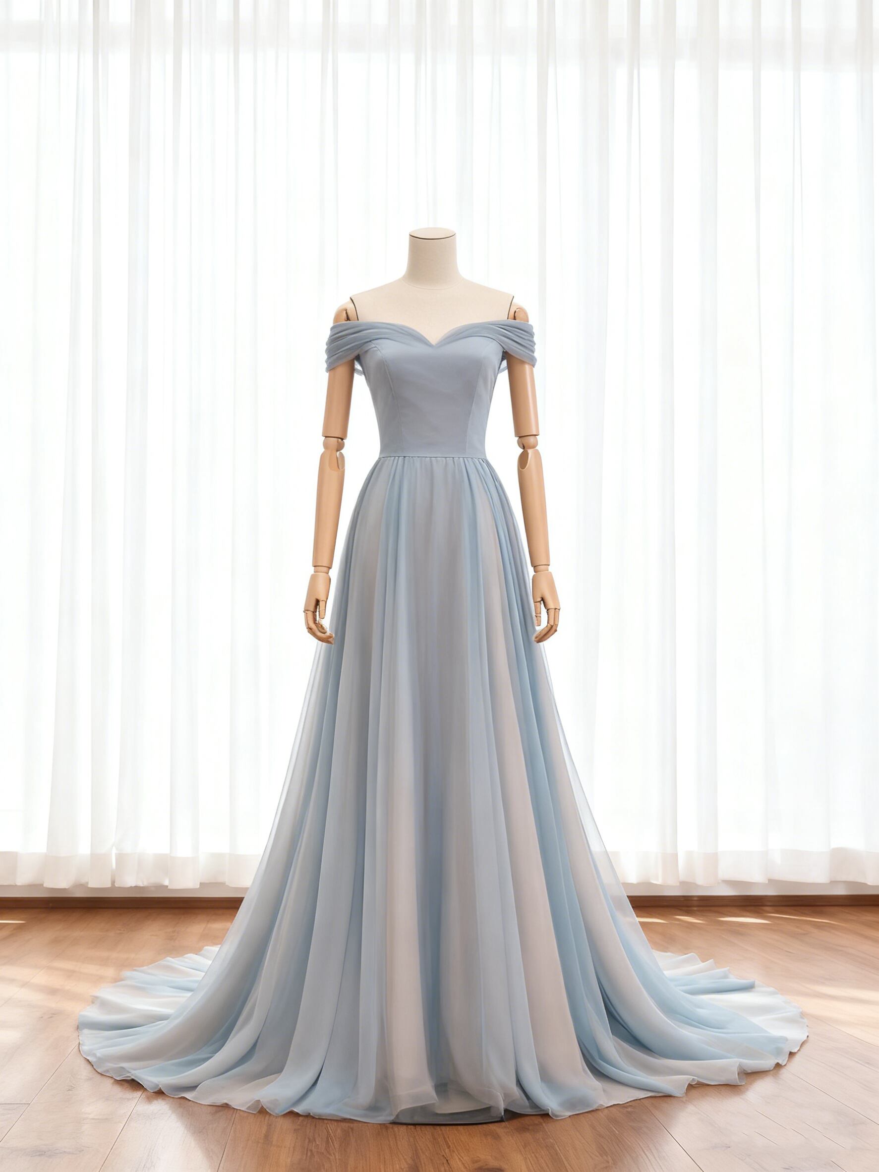 カラードレス ブルー オフショルダー Aライン ピアノ演奏会/音楽会 前撮り ロングワンピース エレガント