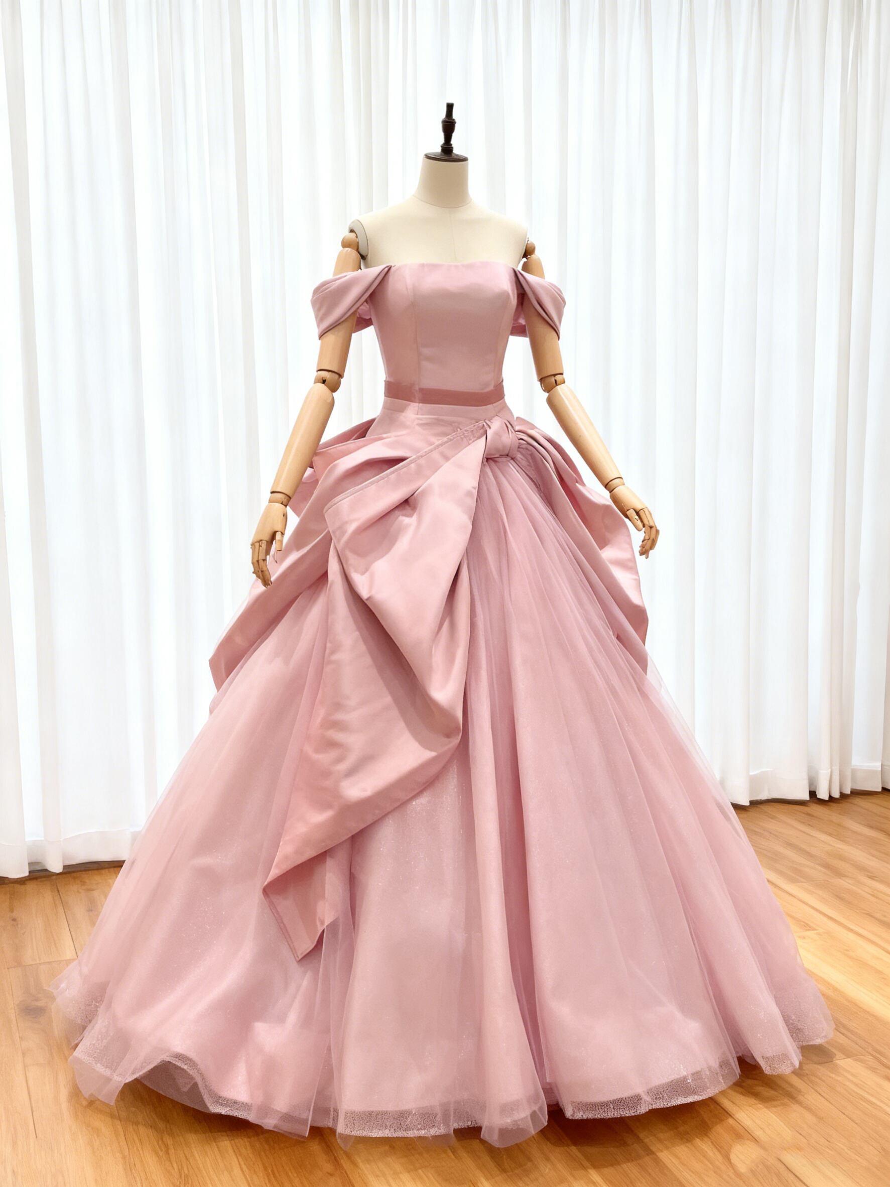 カラードレス ピンク オフショルダー キラキラグリッターチュール リボン プリンセスライン 結婚式 前撮り