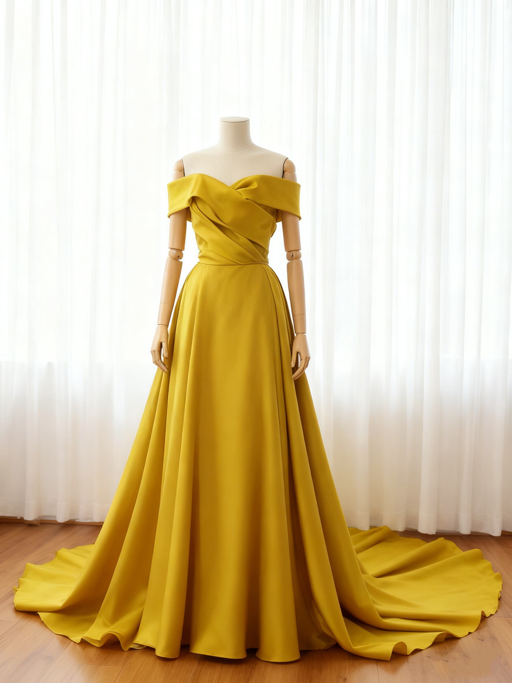 カラードレス イエロー オフショルダー ハンドドレープ Aライン トレーン ロングワンピース 前撮り