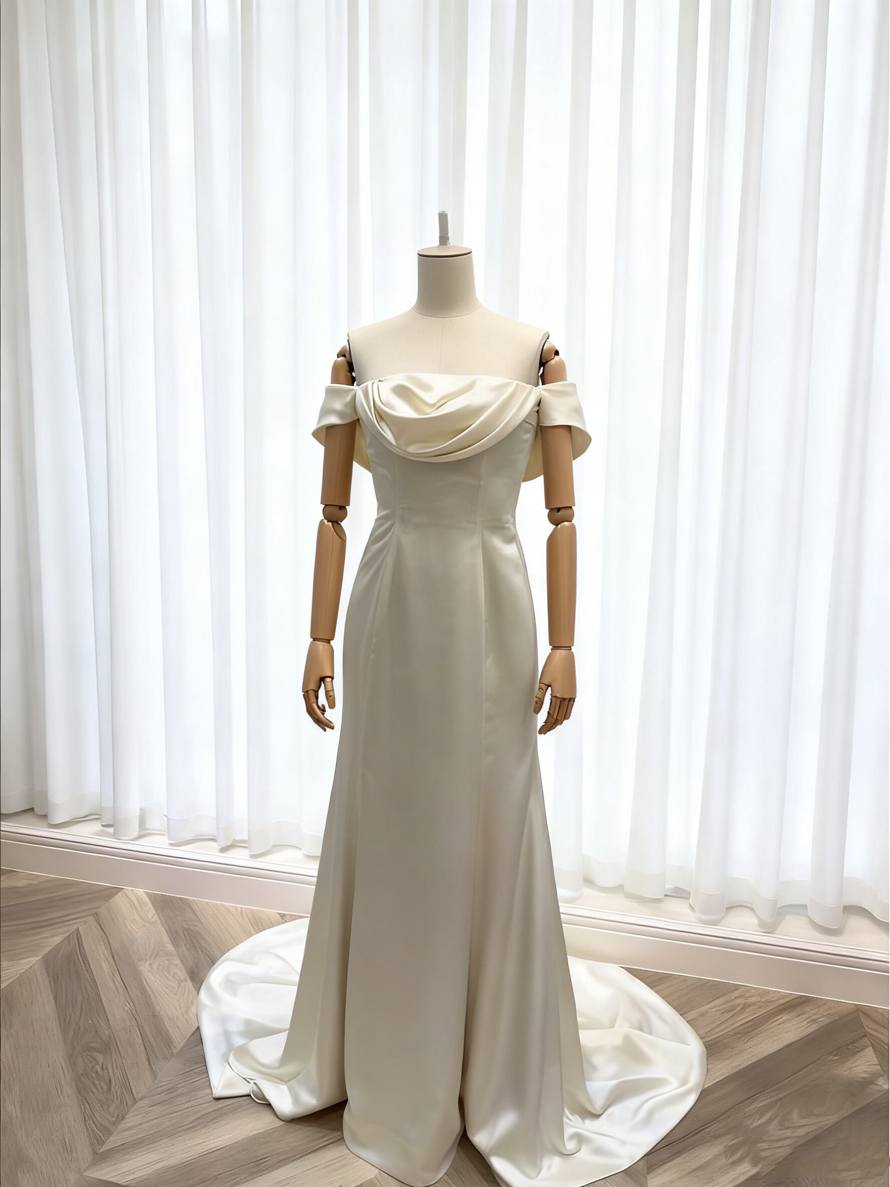 パーティードレス オフショルダー ハンドドレープ ソフトマーメイドライン 光沢サテン 前撮り